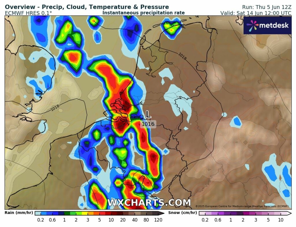 Min of meer zelfde beeld bij EC: vrijdag/zaterdag warmste dagen, dag erna weer minder warm. Zaterdag worden er boven België buien berekent, dus daar valt zaterdag minder warm uit. Maar ook hier de trend van hoogtepunt warmteopstootje op vrijdag/zaterdag, zonder tropische toestanden en dit alles binnen de 10-daagse.