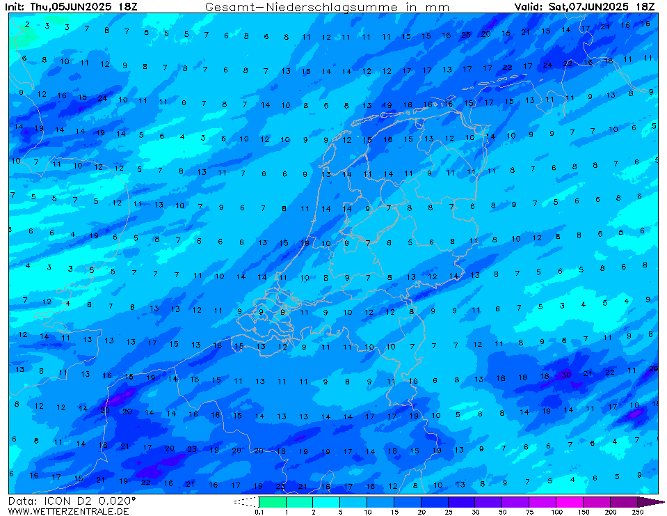 Meeste regen valt dan ook nog eens vannacht. Met al die wind dit weekend zal het snel verdampen.
