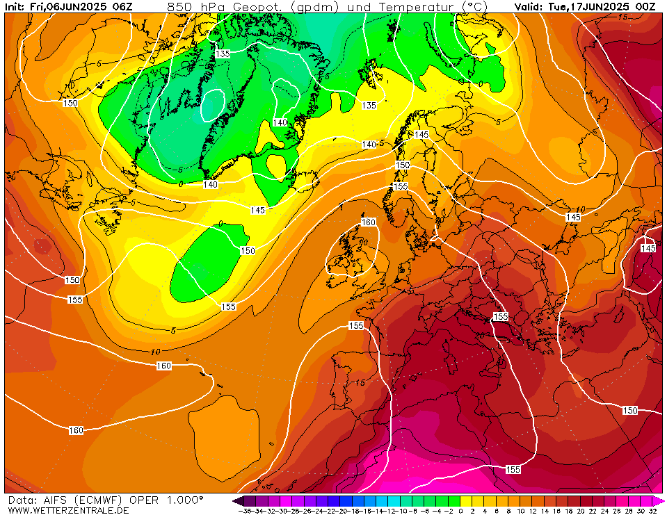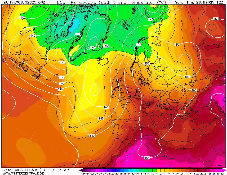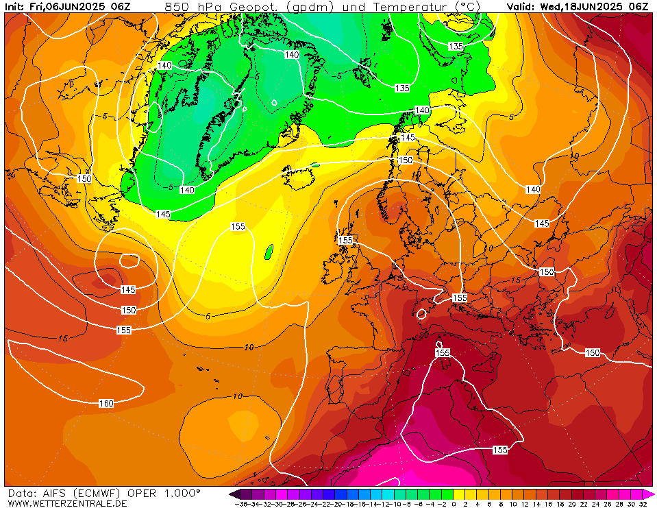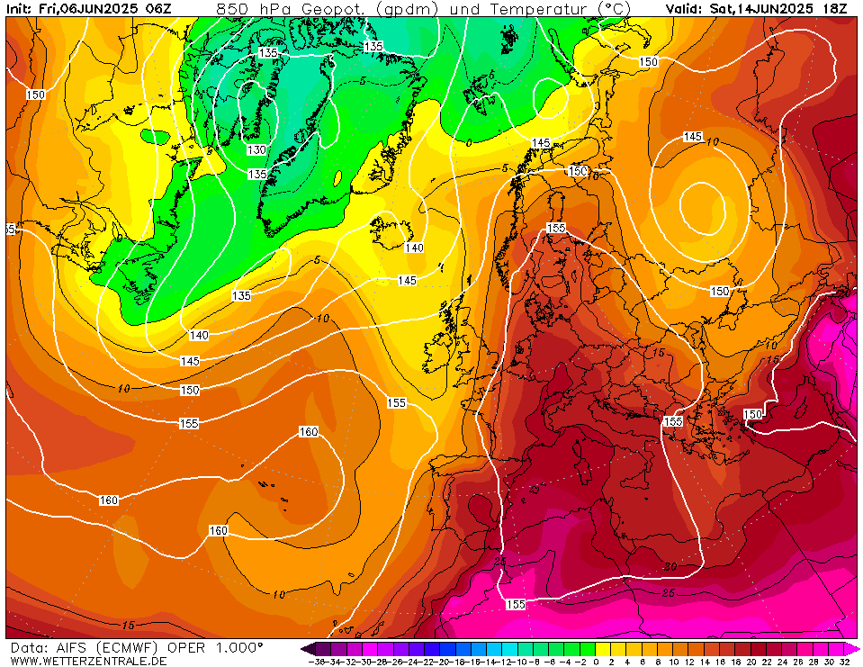 Binnen een week al bovenluchten van 15-20°C op 850 hpa. Daarna een patroon waarbij er hitte op het continent ontstaat wat naadloos hand in hand gaat met voortdurende hogedrukimpulsen vanuit het zuidwesten.