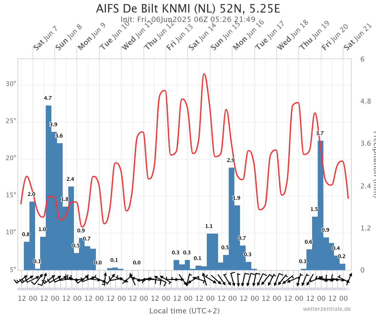 Ik weet niet hoe betrouwbaar dit is, aangezien er soms bewolking en regen weergegeven wordt terwijl er hogedruk boven ons hoofd ligt. In elk geval hierbij het diagram voor De Bilt: