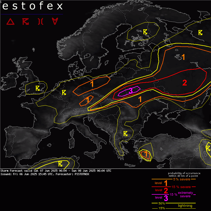 An unseasonably intense mid-level low remains moored in the Norwegian Sea. Its circulation influences large parts of Europe. The axis of a 25-35 m/s mid-level jet runs from the Bay of Biscay to France, central Europe, Poland, Belarus and NW Russia. It is largely collocated with a broad and diffuse, more or less stationary frontal zone. In response to vorticity maxima aloft, several small wave- or comma-like disturbances run eastward on the cyclonic side of the frontal zone from England to the Baltic States. Their timing and intensity, and hence their interaction on convective developments, are limited but difficult to assess.