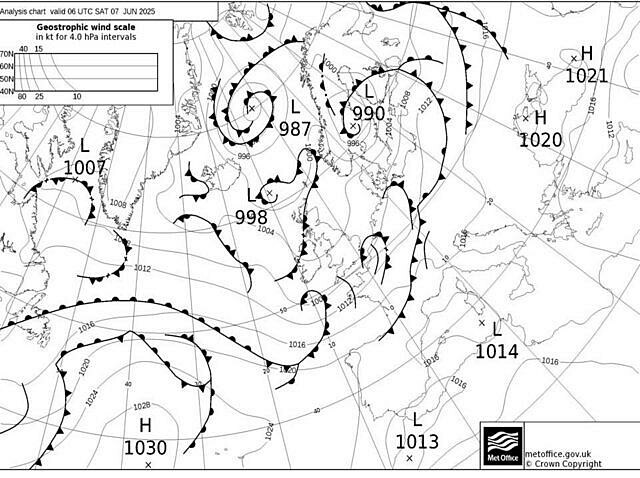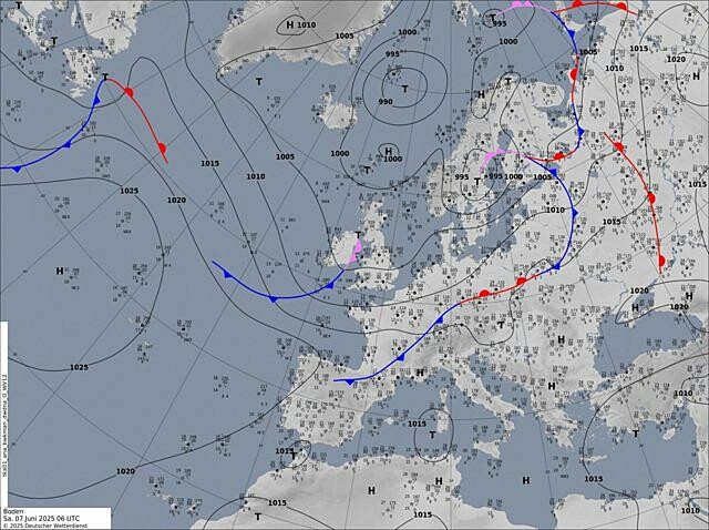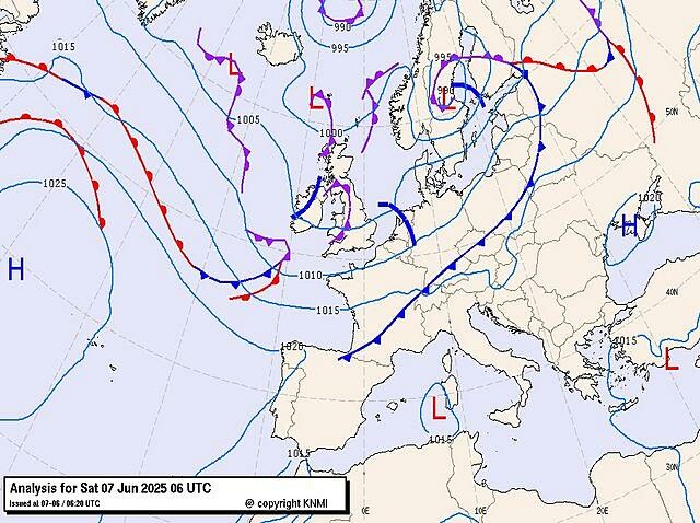 Alleen de Engelsen tekenen in deze regio een soortgelijke krul in. De Nederlandse analyse tekent een buienlijn van noordwest naar zuidoost over Nederland, waar wel wat voor te zeggen is, maar die wordt niet verder naar het zuiden voortgezet. De Duitse analyse geeft over de Benelux helemaal geen frontale structuur, wat toch wel merkwaardig mag heten.