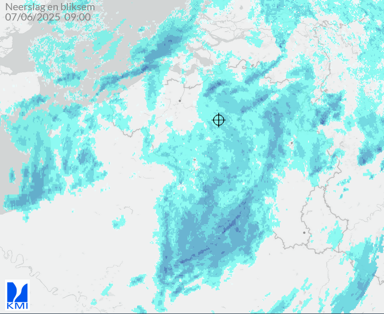 Er zijn ook in de analyse flinke verschillen tussen de verschillende weerdiensten. De werkelijke situatie laat ik wat ingezoomd zien met het neerslagradarbeeld van het KMI om 9 uur vanochtend. Daarop is een mooie krul te zien, met in het zuidelijk deel de structuur van een narrow cold frontal rainband.