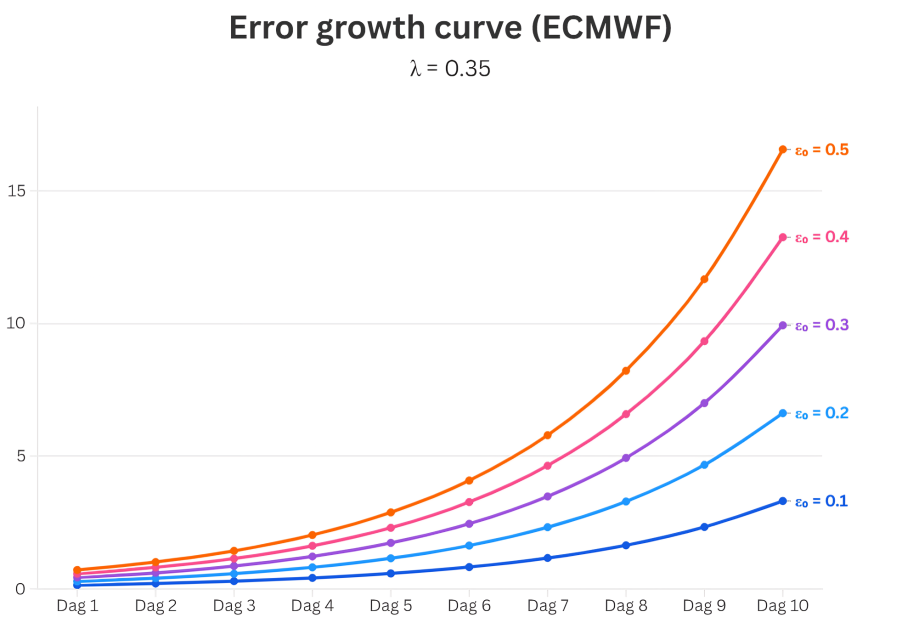 De maximale Lyapunov-exponent van de operationele run van het ECMWF-model wordt beschouwd als 0.35/d, met een range van <0.32;0.41>/d (Bednár et al., 2021). Ik heb een grafiek gemaakt (afbeelding 2) van de growth error curve die verbonden is aan λ = 0.35/d met initial-value afwijkingen van [0.1, 0.5]. De growth error curve toont aan hoe de verwachtingsfout toeneemt over tijd. De growth error curve is een exponentiële lijn, de groeifout neemt dus exponentieel toe. Bij een initiële-waarde-afwijking van 0.1 op dag 1 is de afwijking op dag 10 ongeveer 3.31 en bij een initiële-waarde-afwijking van 0.5 op dag 1 is de afwijking op dag 10 ongeveer 16.56. Aangezien ieder ensemblelid binnen het ECMWF-EPS een andere begintoestand heeft, met andere initiële waarden, ontstaat er op de (U)LT een steeds groter tussen de verschillende ensembleleden - een zogenoemde bifurcatie.