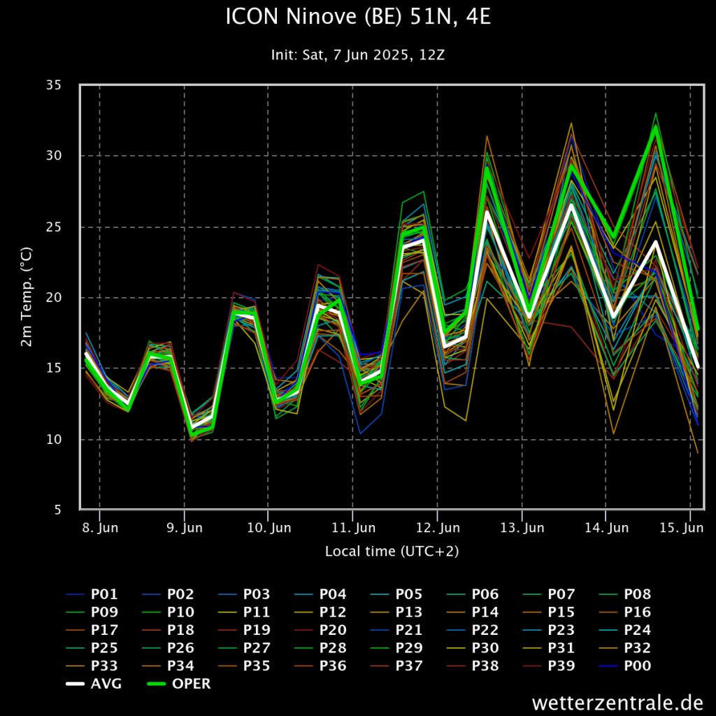 Oper ICON12z ligt bovenin op zaterdag. Kleine 10 graden verschil tussen de oper en het gemiddelde. kwestie van alles wat in perspectief te stellen. Ook al toont deze pluim natuurlijk niet de max. temperatuur