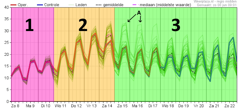 3) Wisseling van de wacht. Hoogtetrog duwt continentale rug weg. Onzeker wanneer maritieme lucht het overneemt, kans is er dat warmte langer blijft hangen. Dat is vooral het geval op zondag en maandag, zie de members bij (A). Onweerskans erg klein, al snel opbouw nieuwe rug vanaf Azoren.
