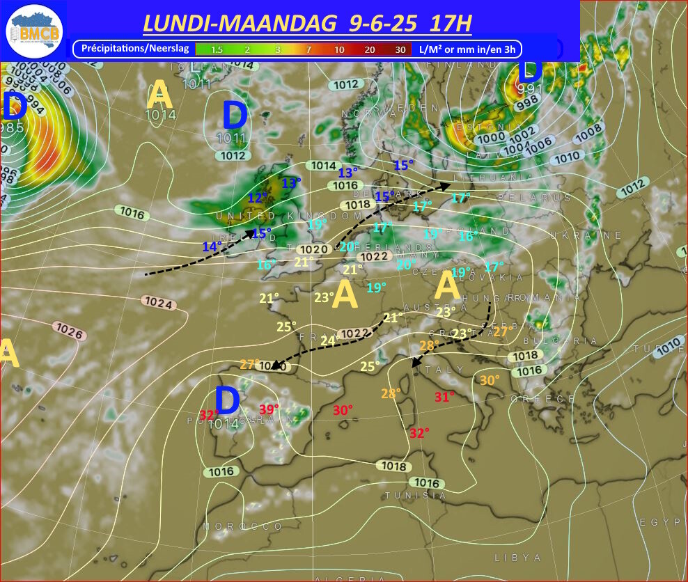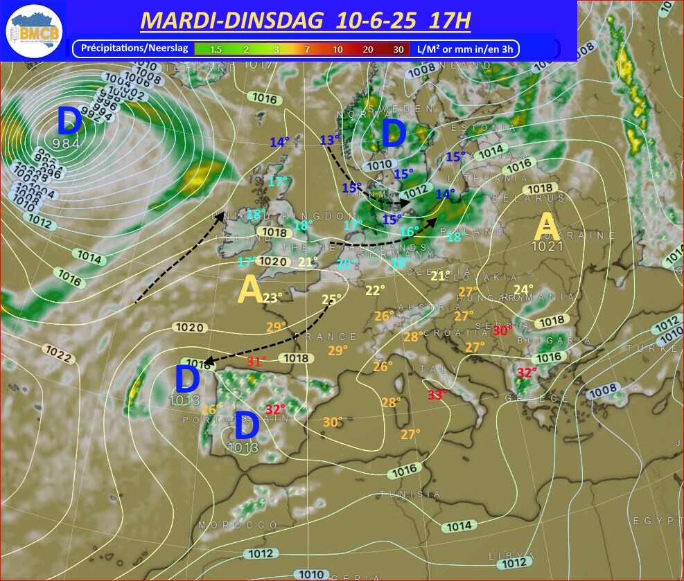 Mardi, un courant océanique humide mais peu perturbé continuera à circuler vers l'est sur l'Angleterre et le Benelux. Dès mercredi, celui-ci sera progressivement remplacé par une masse d'air continental, plus sèche et de plus en plus chaude, à la faveur de l'installation d'un centre anticyclonique entre 1024 et 1028 hPa sur le sud de la Scandinavie.