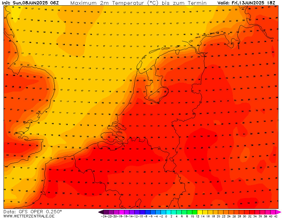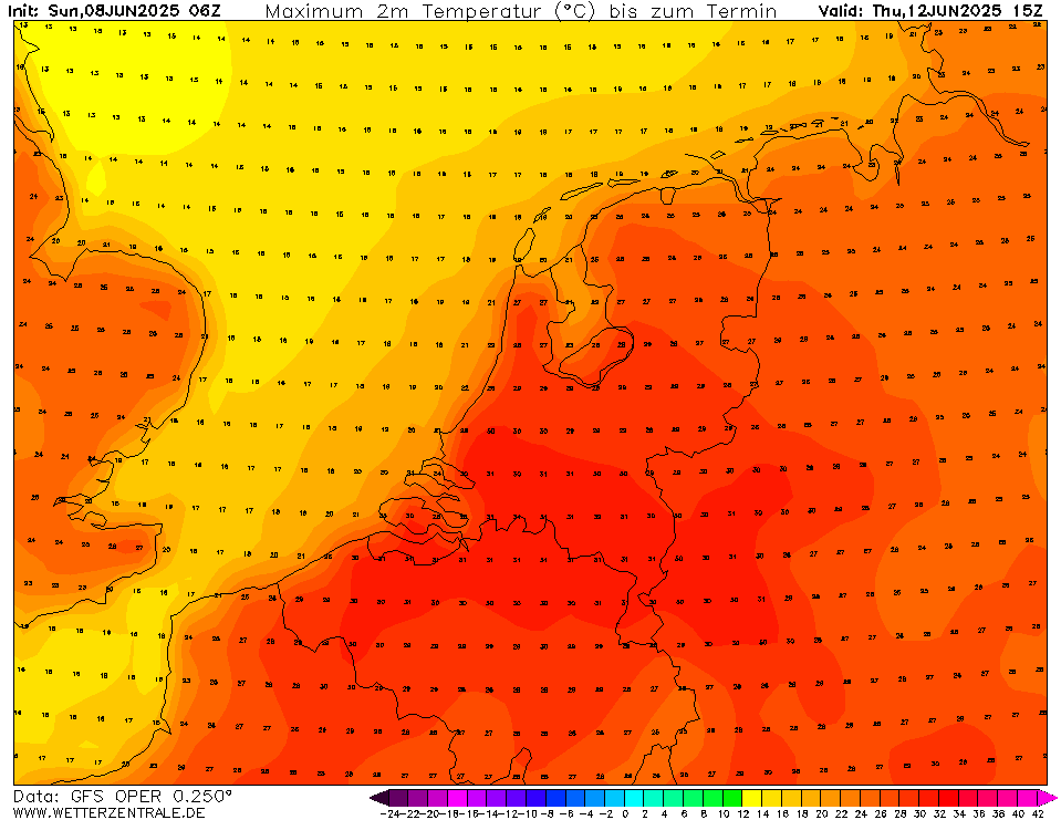 Op grote schaal 30-33°C deze dagen. We gaan zien wat het vervolg brengt, de 20° op 850 hpa staat te trappelen. Edit: zaterdag weer 35plussers.