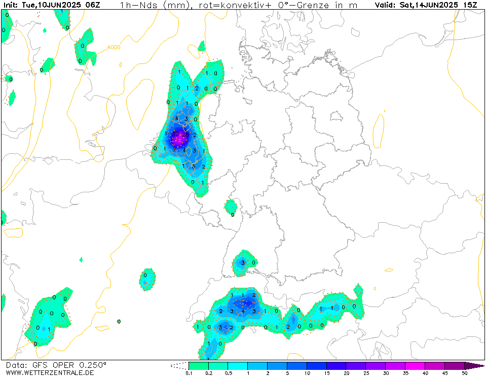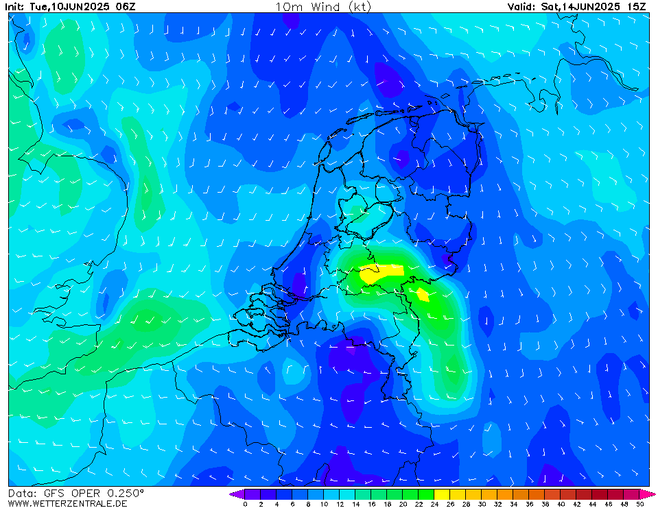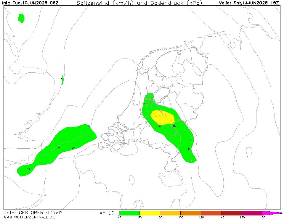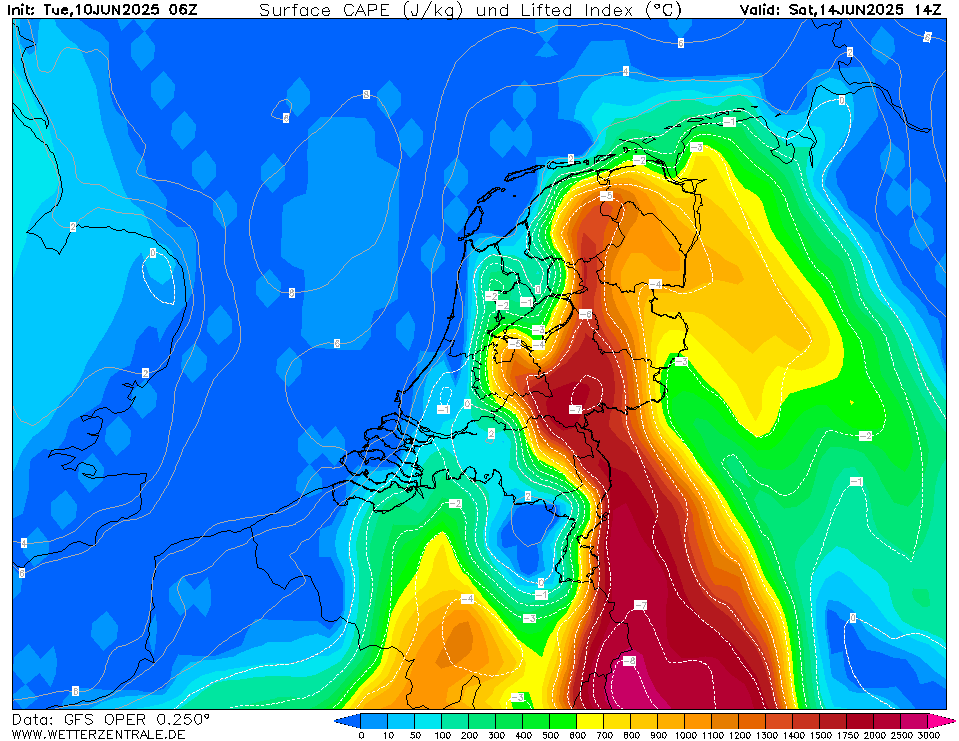 Van de GFS oper. Ik denk op dit moment trouwens dat de kans op onweer vrijdagavond groter is. En zaterdag krijgt de oostgrens misschien nog wat mee van de buien boven Duitsland.