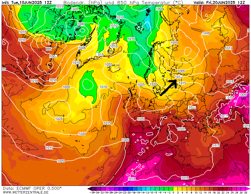Hieronder de kaart van 240 uur vooruit toegevoegd. Een hogedrukkern boven de Benelux lijkt een noordoostelijke koers te volgen als ik de kaarten zo bekijk, waardoor een nieuwe golf zeer warme lucht vanuit het zuiden zou kunnen opstomen:
