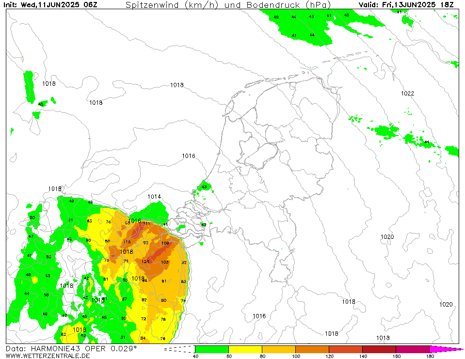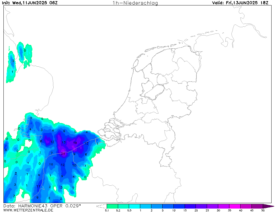 De neerslagpiek bij Veurne is goed te begrijpen als je deze kaarten ziet. Het grootste deel van de buienlijn trekt de Noordzee op, zoals de andere modellen ook aangeven. Maar de timing is bij Harmonie veel eerder. Bij de andere modellen zit dit MCS nog in Normandië op dit tijdstip. Dit verschil komt vermoedelijk mede door de hoge treksnelheid van het systeem (rond de 100 km/h) en ik denk dat Harmonie dat toch beter in kan schatten dan de globale modellen.