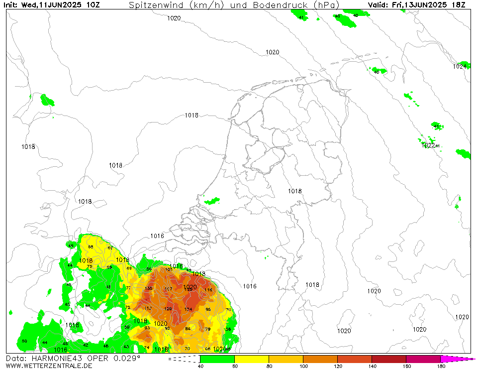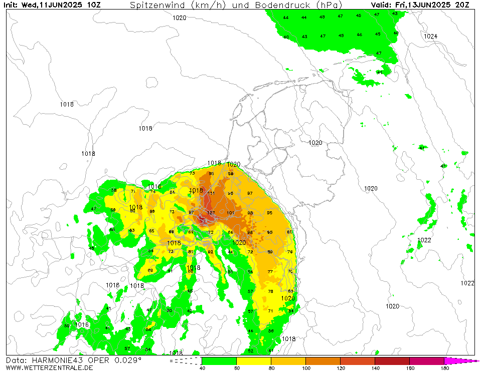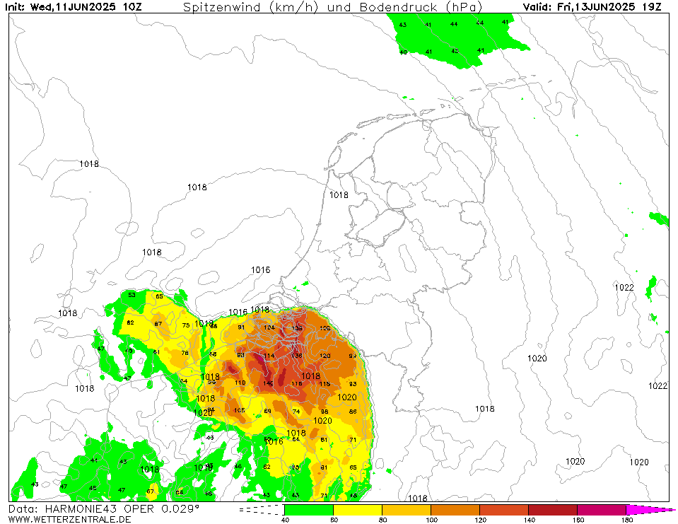 Grootschalig rond de 100 km/h en heel lokaal een flink stuk daarboven. Blijft de vraag of Harmonie hierin alleen staat of dat de andere fijnschalige modellen volgen. Na 22:00 is de kans op extreme windstoten lager aangezien de convectie na zonsondergang niet meer vanaf de grond gevoed wordt (effectieve windschering wordt kleiner) en de onderkant van de grenslaag stabiel wordt (windstoten dringen minder door tot oppervlak).