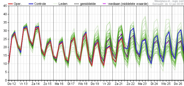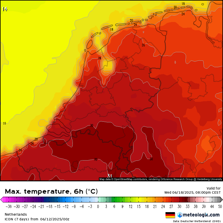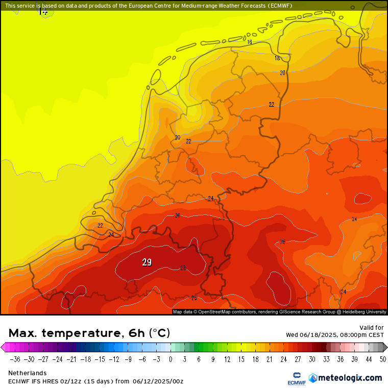 De ECMWF OPER komt met 28-29 graden in het zuiden van de Benelux, maar we weten dat ECMWF wel eens te laag kan zitten (zoals vandaag/morgen). ICON gaat op grote schaal naar 28 - 31 graden.