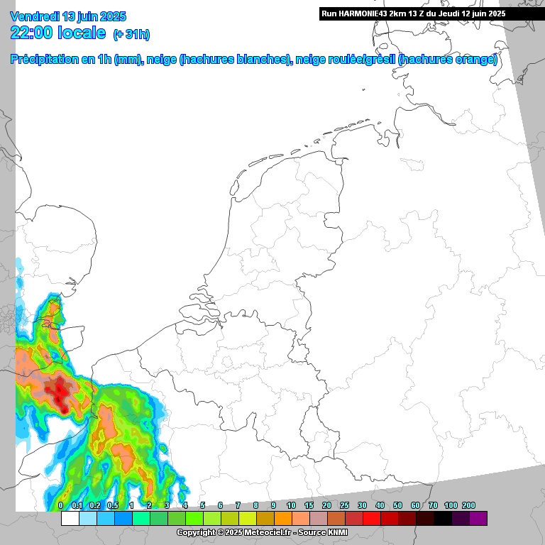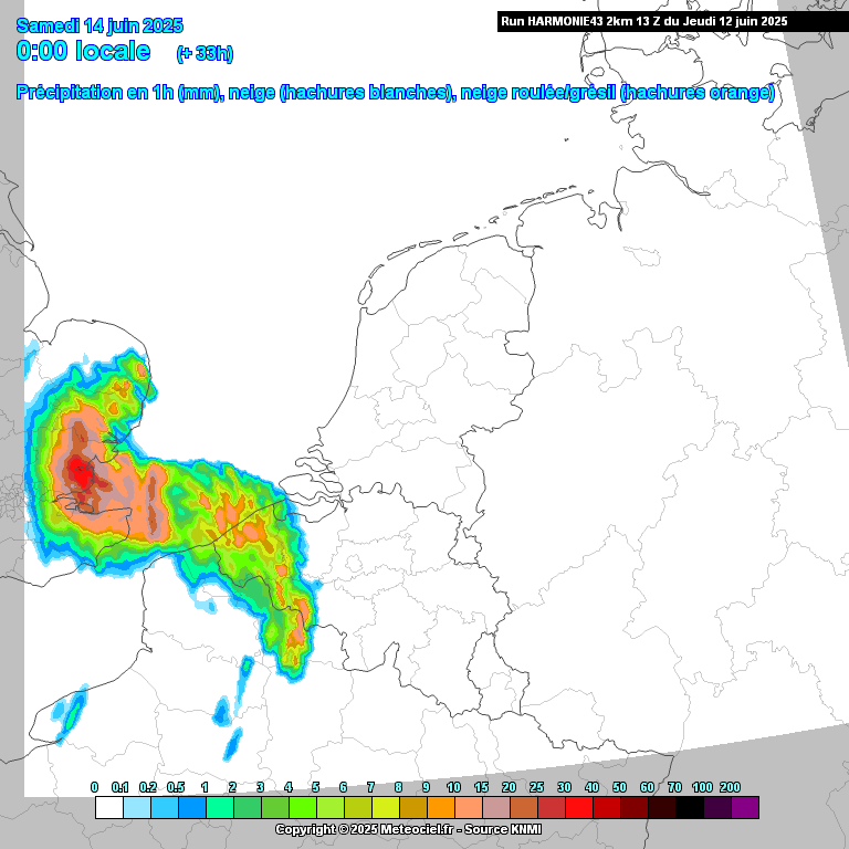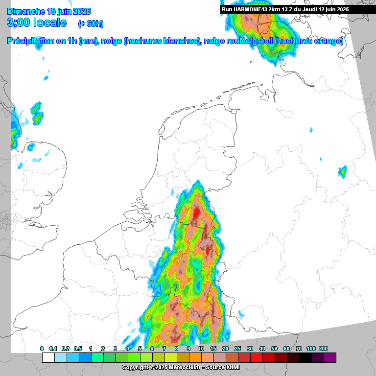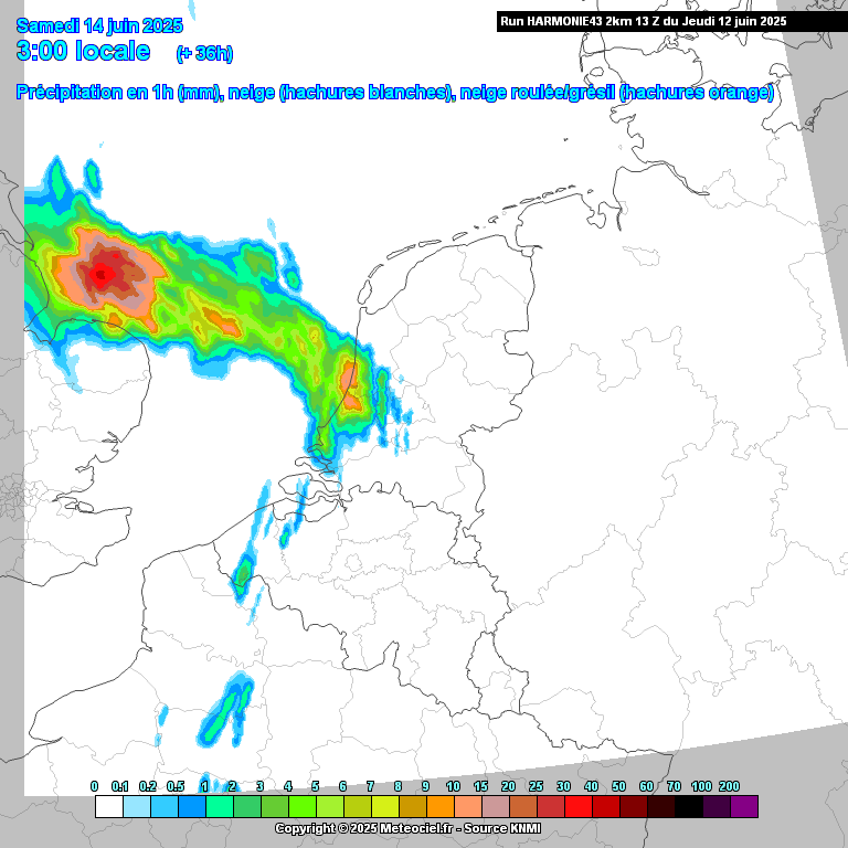 Zie hieronder (meteociel) plaatjes met uur neerslag sommen.