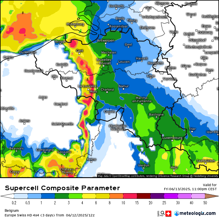 Gemiddeld genomen van de meest gangbare modellen (GFS, ECMWF, SWISS HD, Harmonie, ICON D2, WRF) lijkt onderstaande kaart mij een mogelijks goede inschatting. Of het daadwerkelijk een MCS gaat worden betwijfel ik alsnog, maar het is zeker mogelijk. De SCP (supercell parameter) en SRH lijken maar een relatief kleine overlap te hebben met de verwachte neerslagsignalen, waardoor het mij lijkt dat eventuele supercells voornamelijk op de voortrekkende buien mogelijk zijn, niet zozeer ingebed of erachter.
