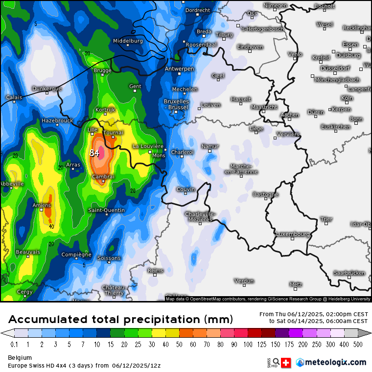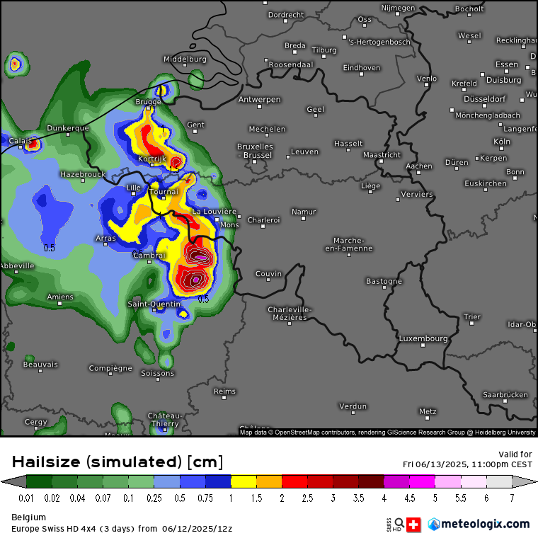 Timing is ook al wat heen en weer gegaan de afgelopen runs maar nu lijkt het zwaarste toch wel eerder de (late) avond te worden. Enkele cellen in de namiddag en vroege avond zijn al mogelijk, maar het grotere systeem zal vermoedelijk na 22u maar zijn.