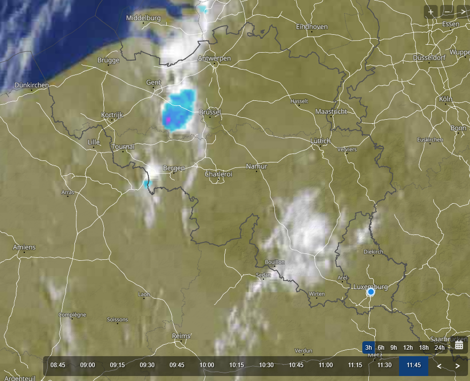 Hier te zien op de schaal van Belgie. Dit satellietbeeld is van 11:45, mijn foto van precies 12 uur.