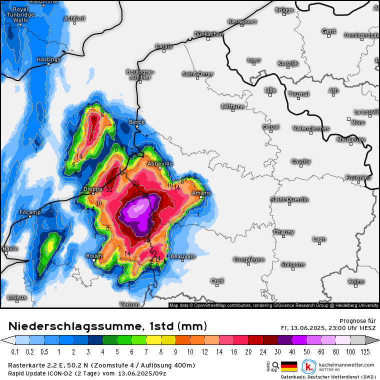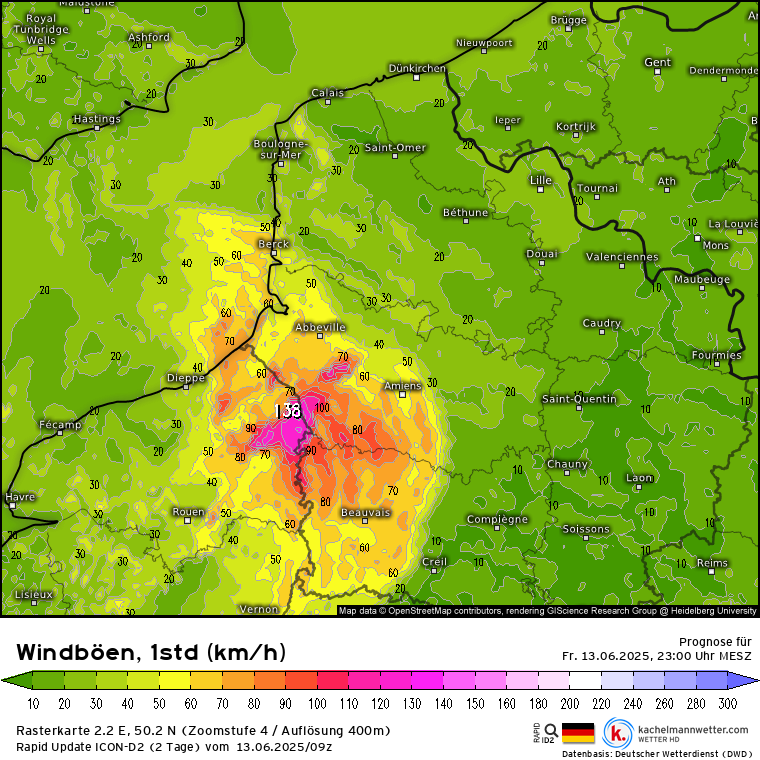 Dat wordt een echte ploffer volgens ICON-D2 09Z, met heel veel neerslag in korte tijd, en windstoten tot 140 km/h?! Deze berekening staat niet op zich, en ook Arome 06Z geeft daar nu een soortgelijke ontwikkeling.