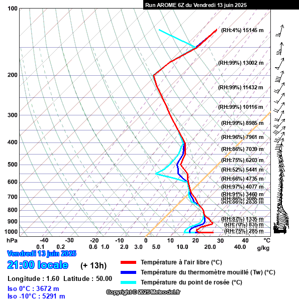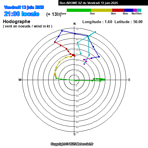 Hieronder de sounding voor vanavond 21 uur voor een plaats tussen Abbeville en Dieppe, zoals berekend door Arome 06Z. In die berekening is het windfront al voorbij, en de neerslag komt er nog aan. Toch wel een markante sounding zou ik zeggen, zeker samen met het hodogram (tweede afbeelding), waarin vooral de extreme shear onderin opvalt, maar dat is nu juist het gevolg van het al gepasseerde windfront.