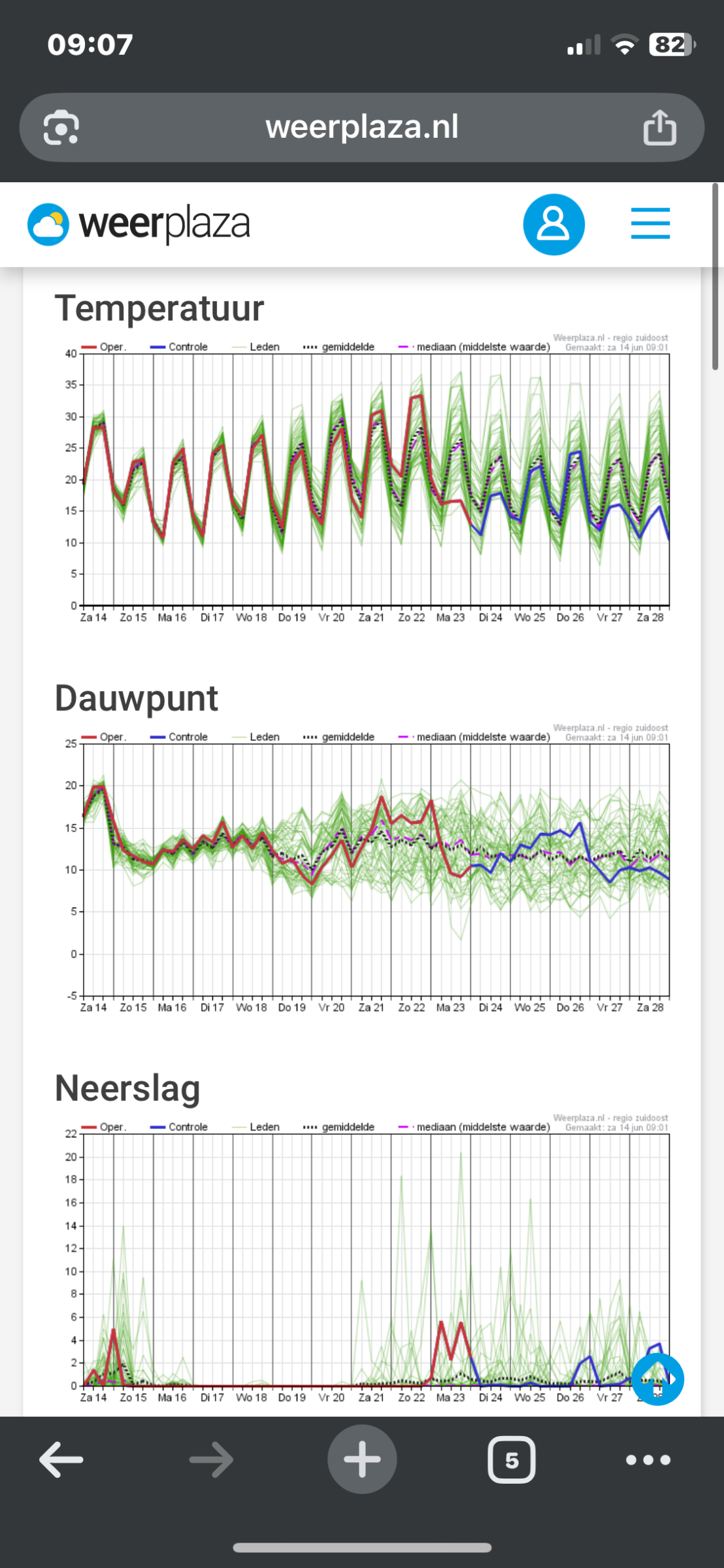 Thermisch steevast ver boven onze stand. Dat betekent voornamelijk; heerlijke temperaturen! Het klimatologisch gemiddelde voor midden juni is voor mij persoonlijk toch net even te fris namelijk. Ik denk dat de meeste mensen vooral gaan genieten van het weer doordeweeks. In het weekend kan het opnieuw zeer klam worden.