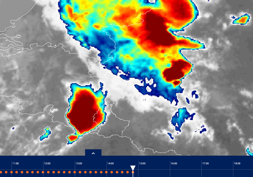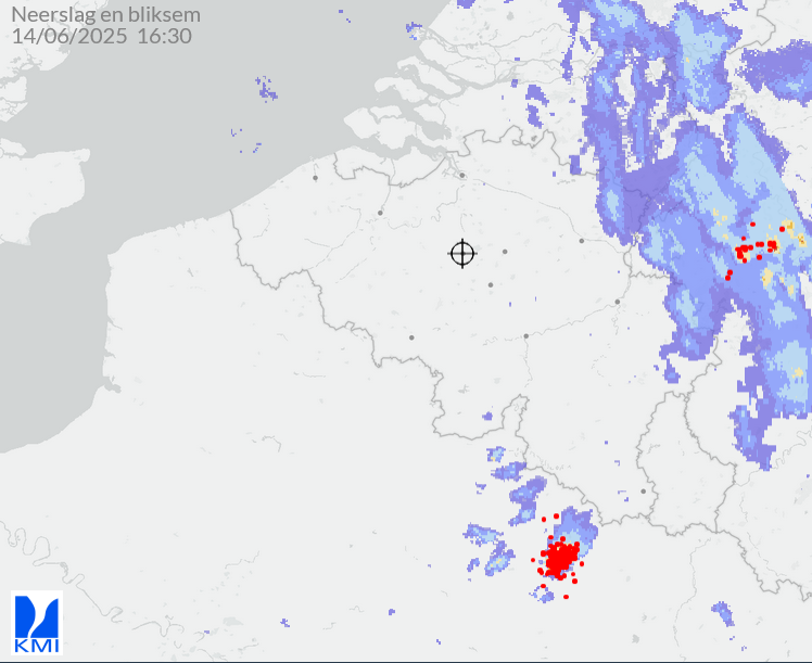 Edit: bedoel je met rode pitten het gekleurde wolkentoppen-beeld? Dat is dus het cirrusscherm van de bui in het zuiden, dat ziet er wel fors uit maar de bui stelt niet veel (meer) voor.