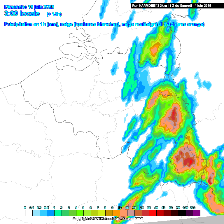 Het gaat vooral om wat er vannacht kan gebeuren, zie de tweede afbeelding van Harmonie 11Z, en de derde van ICON-RUC 14Z.