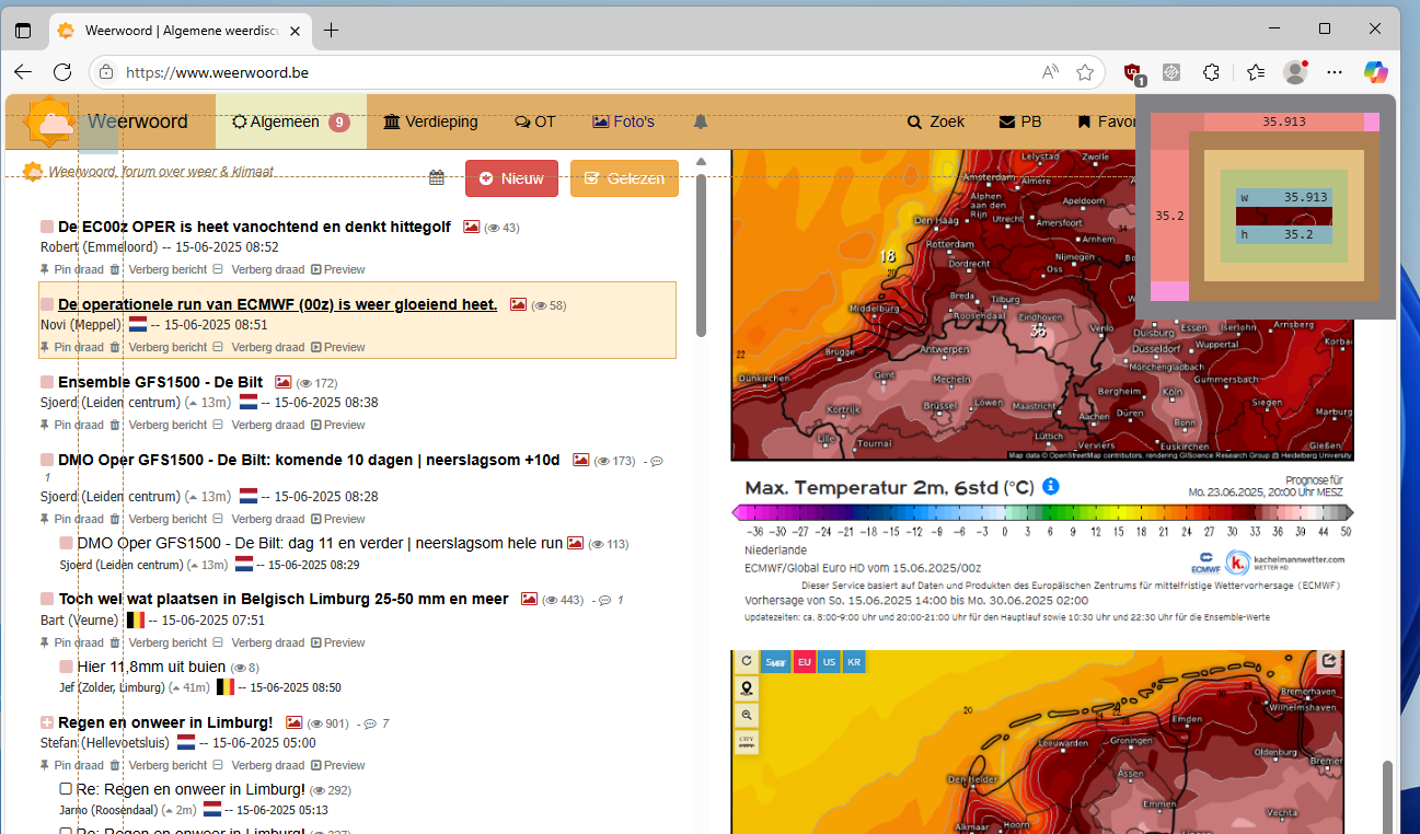 Gisteren had ik al last van de warmte, ook omdat het in huis inmiddels slecht te doen was. Hoge luchtvochtigheid van meer dan 70% en hoge temperaturen. Bij het zien van dit soort kaarten, zakt bij mij de moed dan ook in de schoenen.