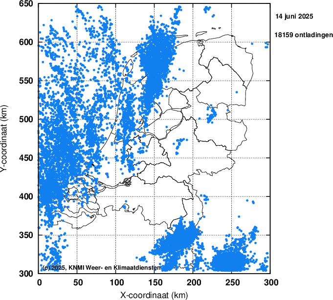 Bijgevoegd. Kaartje ontladingen KNMI. Verschil trekrichting van de eerste buien en daarna leftmover goed te zien..