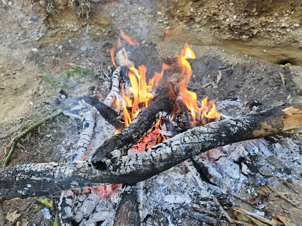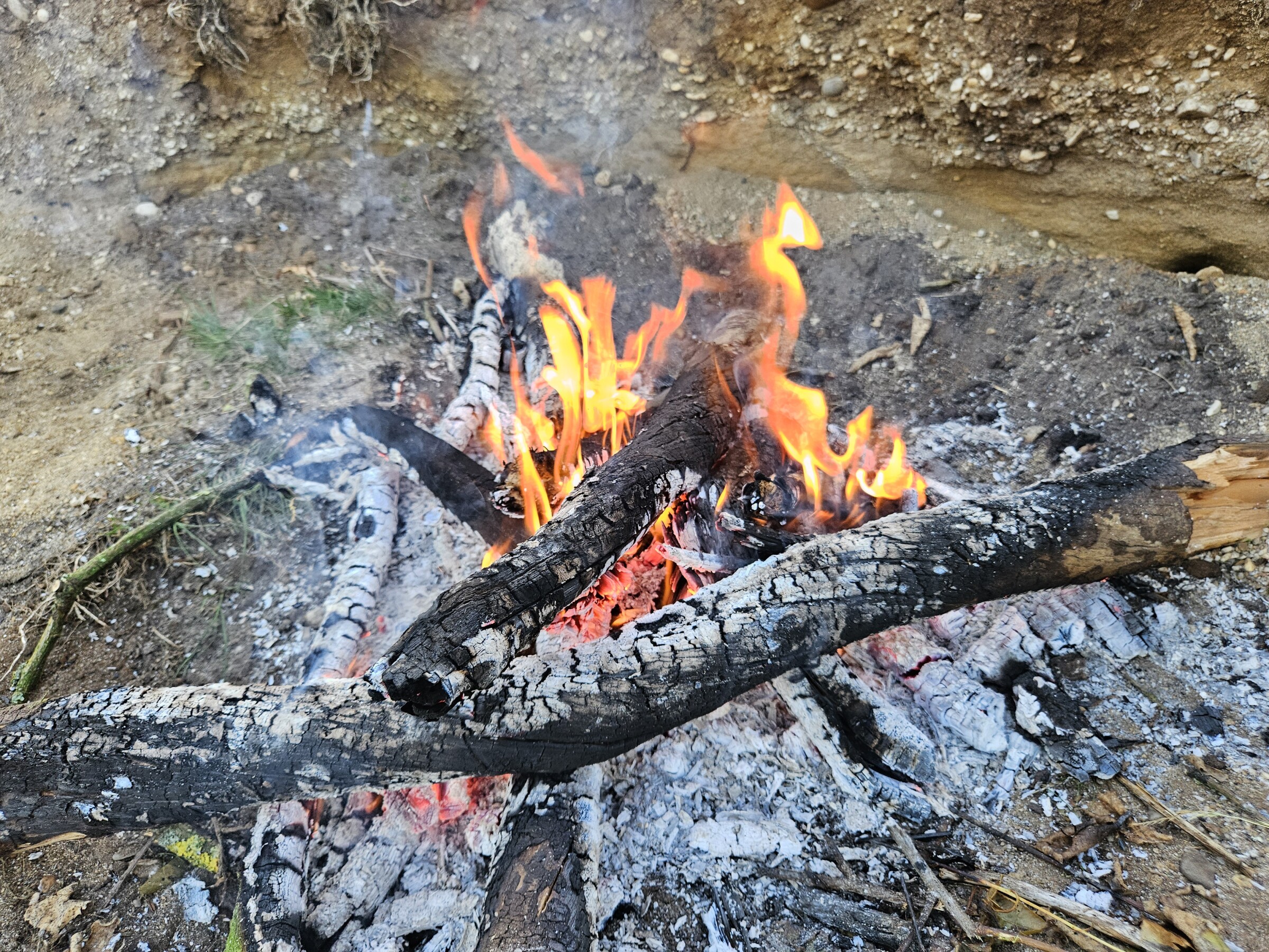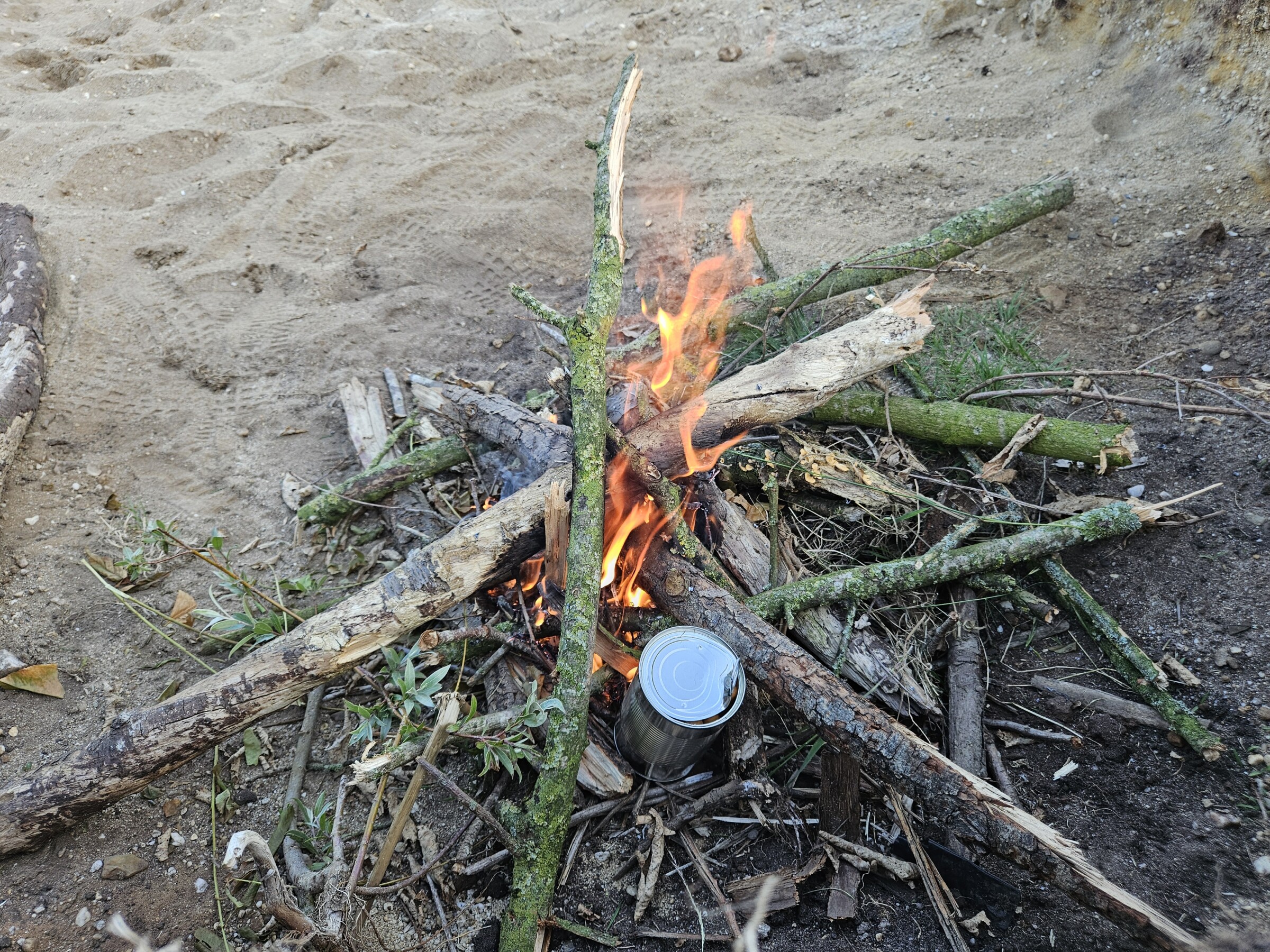 Water wat nu nog verfrissend koel was, heel bescheiden kampvuurtje en wat blikken warme knakworstjes met volkoren bolletjes.
