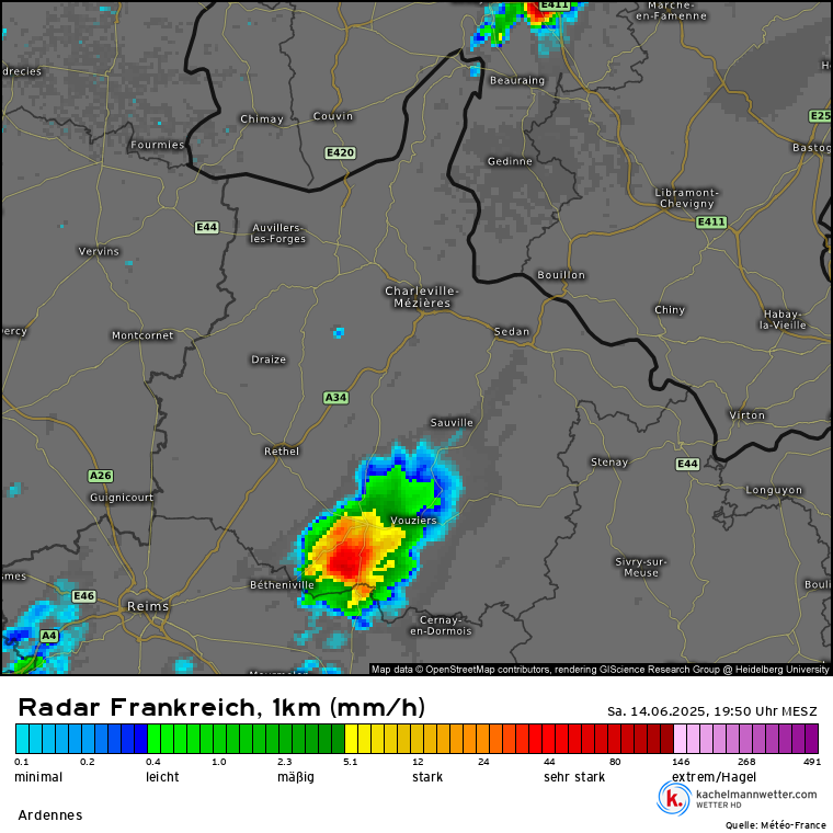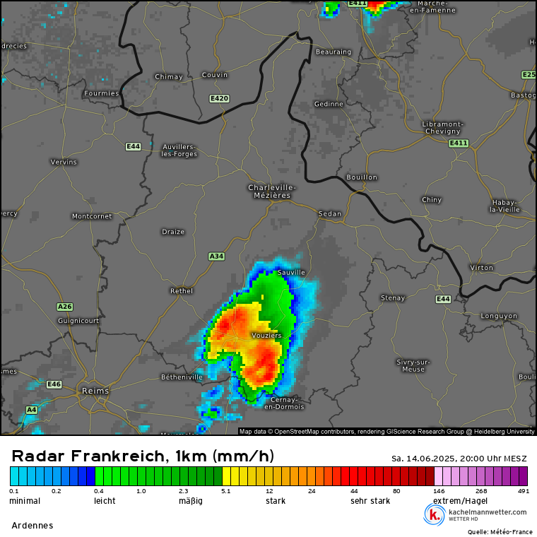 Gisteravond was er een opvallende cel in het noorden van Frankrijk, die hier ook genoemd is, met een 'V-notch' en iets wat leek op een hook echo. Dat laatste leek me net niet het geval, maar daar gaat het me hier niet om. Mijn punt is hier dat volgens de analyse van Kachelmannwetter deze cel forse hagel heeft geproduceerd, en bij de ESWD zijn daar inderdaad meldingen van binnengekomen. Maar als je naar die gegevens kijkt was er wat later rond 20:00 uur nog een cel die hagel tot ongeveer 3 cm gaf, en daarvan is niets te vinden bij Kachelmann. De oorzaak is dat de neerslagintensiteit bij die cel niet zo hoog werd ingeschat. Deze was in werkelijkheid waarschijnlijk een stuk hoger. De vraag is hoe dat mogelijk is, en wat er dan fout gaat bij de bepaling ervan.