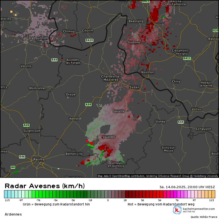 De cel vertoonde een duidelijke split, en het lijkt wel dat daarbij en daarna een soort afscherming plaatsvond die ervoor zorgde dat de neerslagintensiteit op de radar duidelijk te laag werd weergegeven. De Dopplerradar (van Avesnes, een eind naar naar het noordwesten) heeft een gat in een gebied waar duidelijk neerslag viel. Merkwaardig is dat.