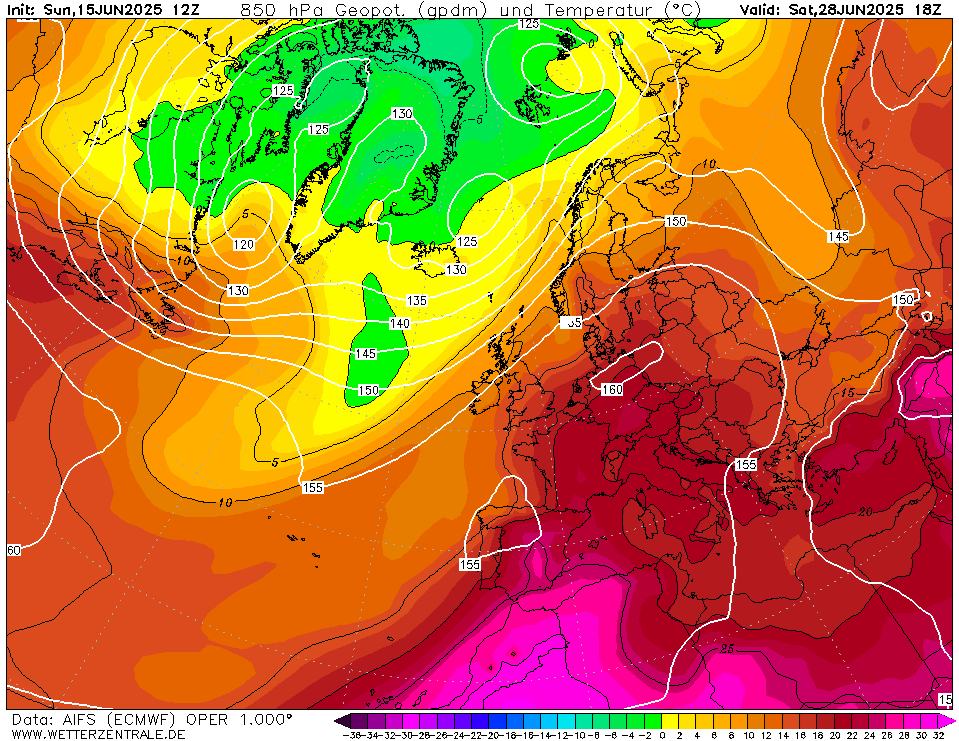 Hartstikke UGKB natuurlijk (kaartje van 318 uur vooruit) maar een warmbloedig hoog veroorzaakt in deze run hitte op grote schaal op het Europese continent, waaronder in de Benelux. Waarden van 35 graden lijken haalbaar in dit scenario: