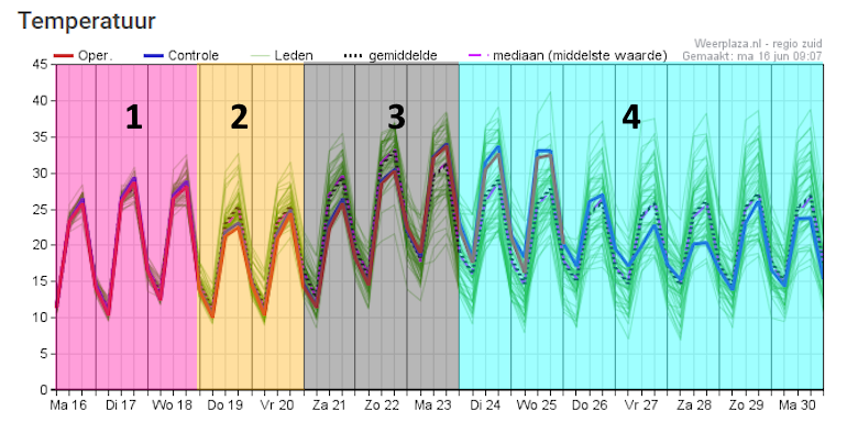 4) Meest waarschijnlijke scenario: hoogterug wordt oostwaarts geduwd waardoor we in maritieme lucht terecht komen. Temperatuur doet stapje terug. Er is echter ook kans dat hoogterug veel langer blijft liggen met weinig stroming en blijvende hitte (scenario Oper). Ligging hogedrukkern is bepalend: met aanlandige wind is zuiden uiteraard het warmst. Veel spreiding, begint op maandag al. Sowieso blijvend droog in vrijwel alle scenario's.