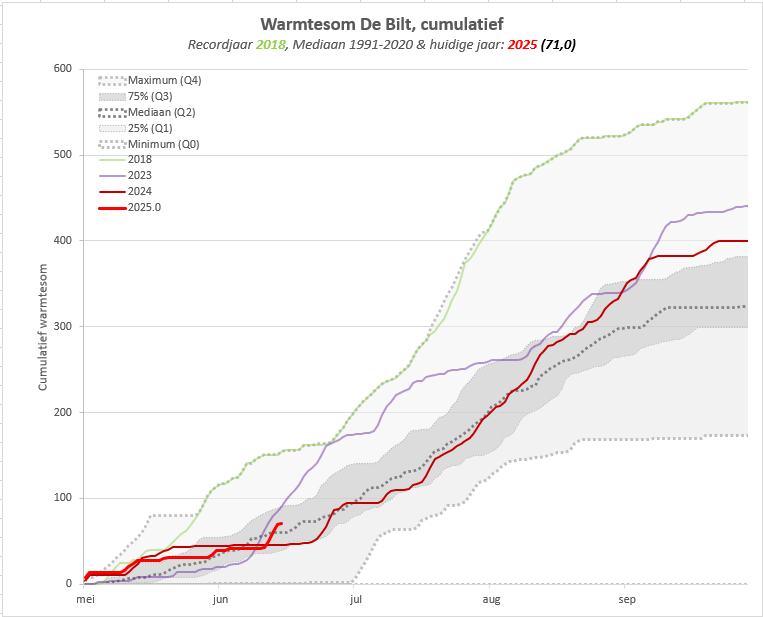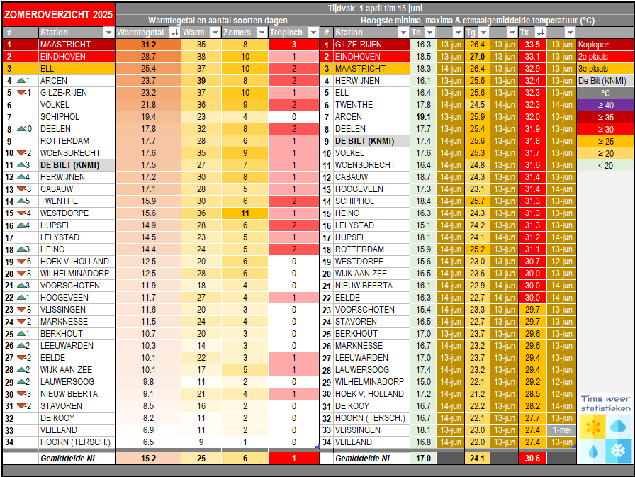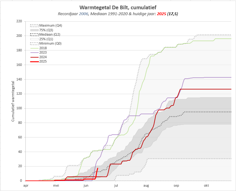 De afgelopen dagen zijn behoorlijk wat warmtegetallen behaald. Maastricht houdt ruim de leiding met een warmtegetal van 31,2. De gemiddelde warmtegetal-som in Nederland bedraagt nu 15,2 (De Bilt 17,5) met gemiddeld in het land 6 zomerse dagen (De Bilt 7) en 1 tropische dag. Westdorpe telt al 11 zomerse dagen en Maastricht telt 3 tropische dagen. De hoogste etmaalgemiddelde temperatuur van 27,0°C werd behaalt in Eindhoven op 13 juni.