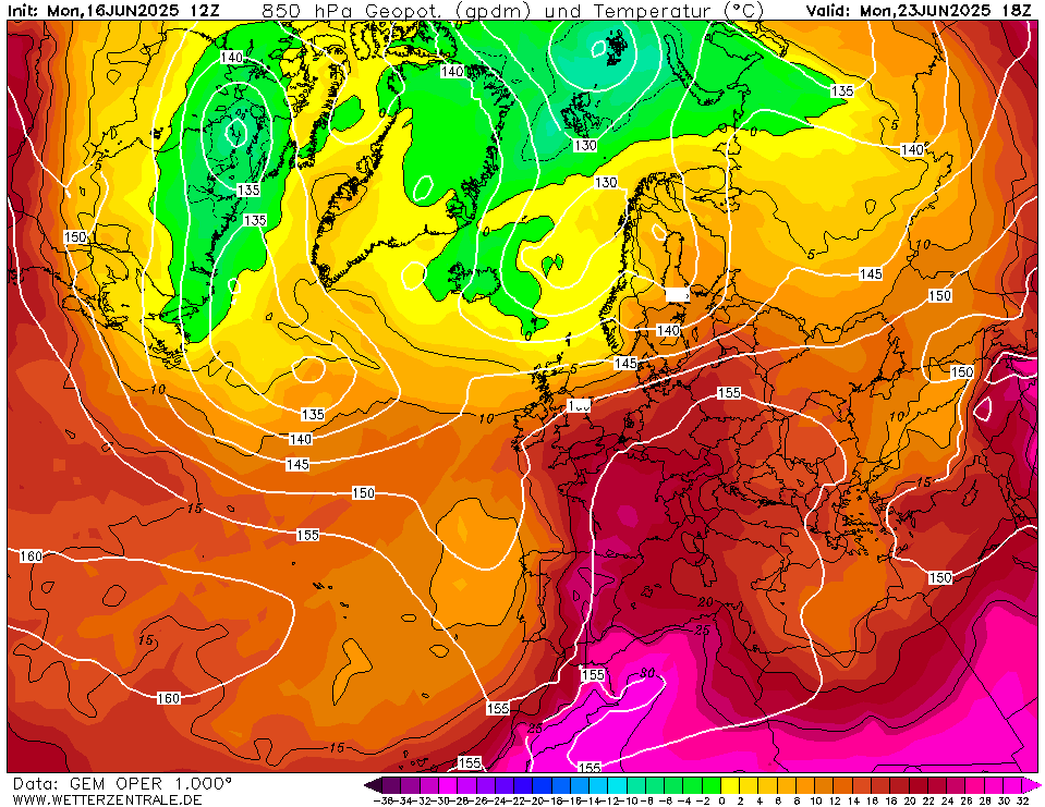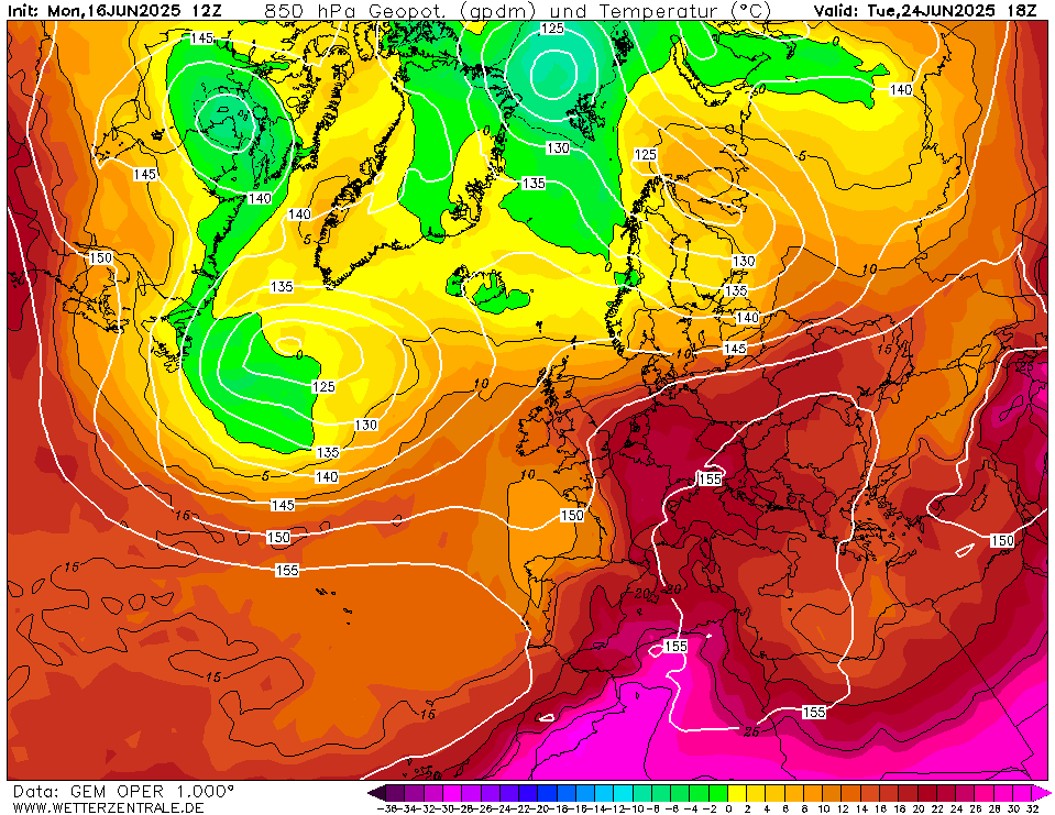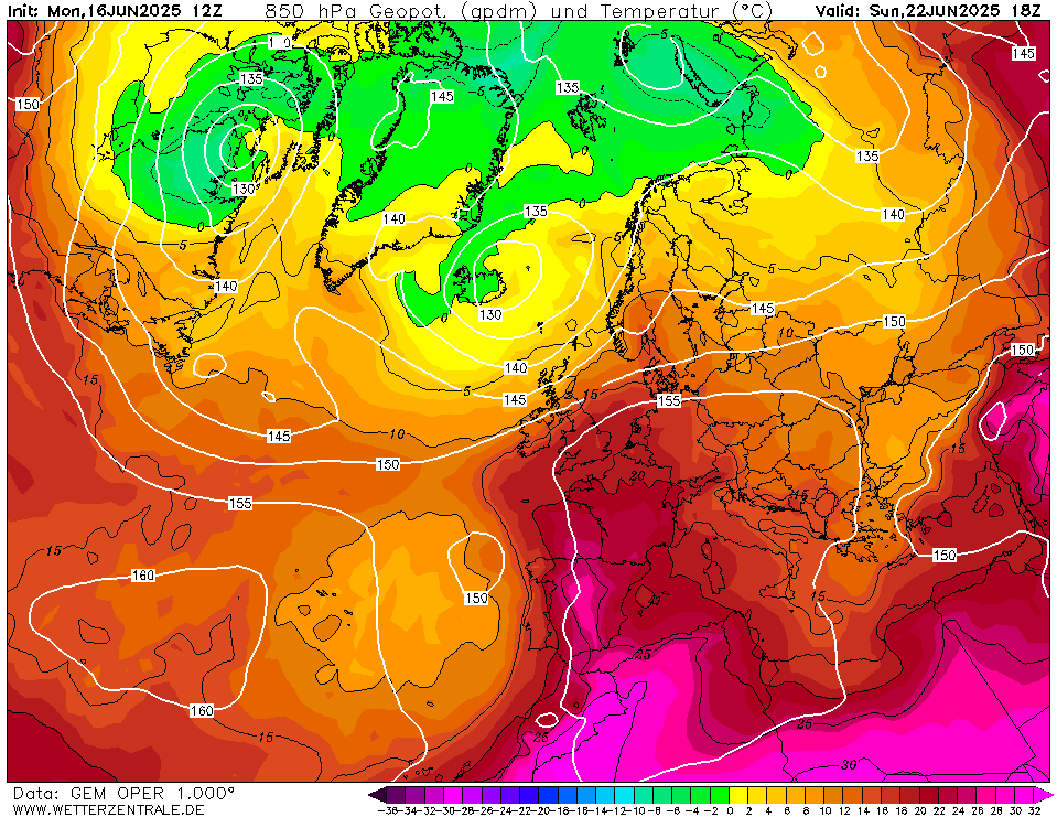 T850 naar 20 graden of iets erboven. Regionaal dikke 35'ers mogelijk, m.n. op de dinsdag op vrij uitgebreide schaal dat soort waarden in deze run.