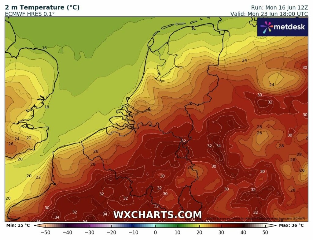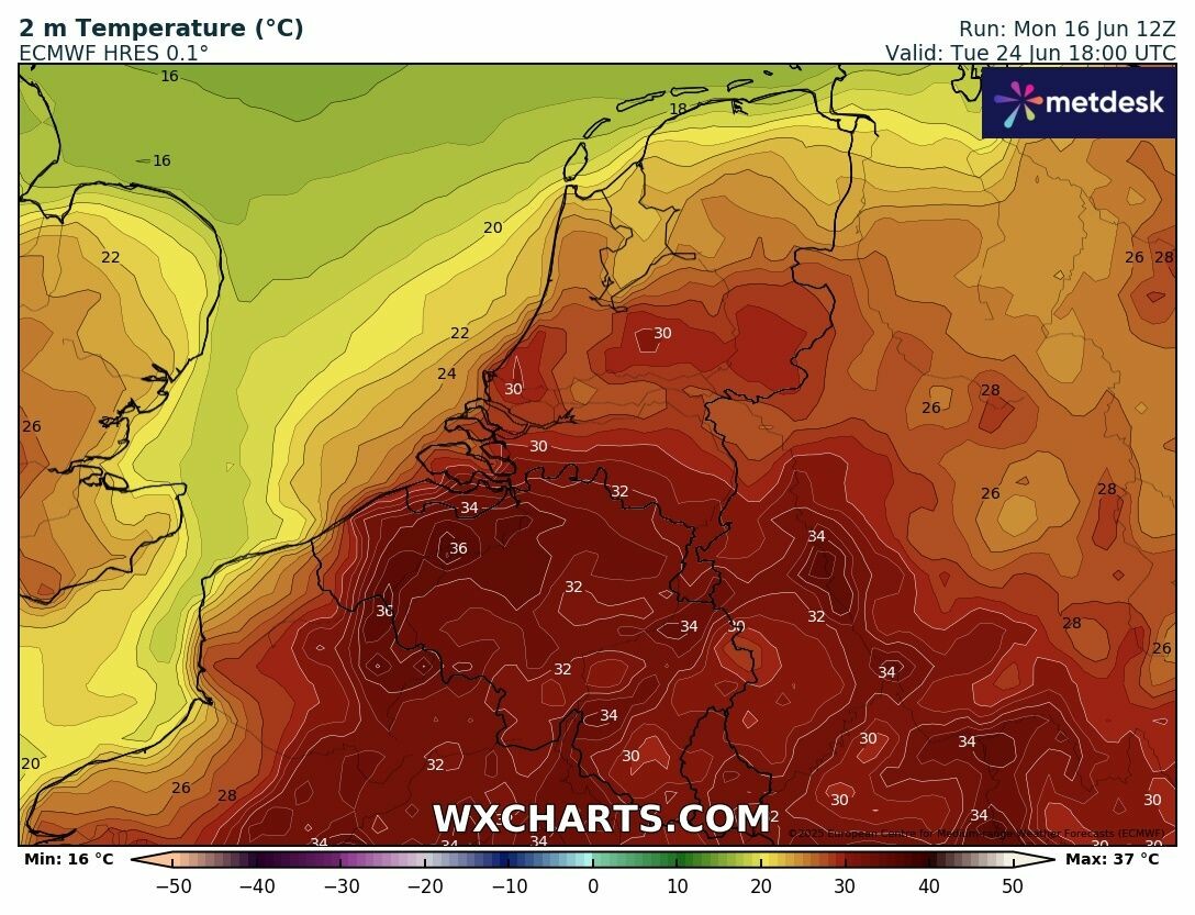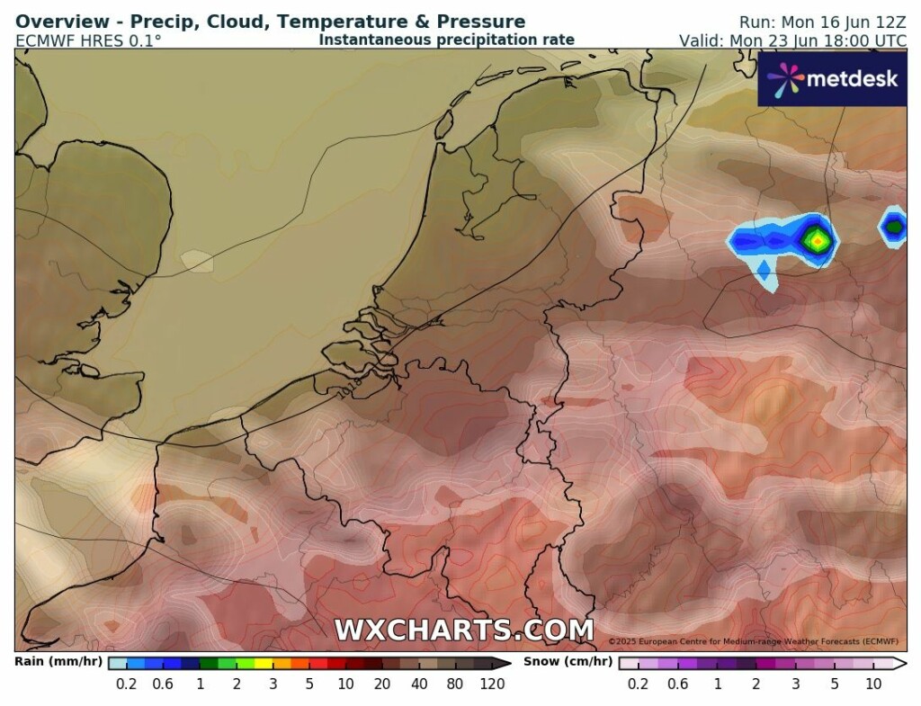 Dus daar zouden ze dan volgens deze berekening van de EC-oper weinig last van de hitte moeten hebben... Dit gaat gepaard met een bui bij het Duitse Bielefeld.... Allemaal naar het noorden dus! Ook dinsdag in het noorden aangenaam. In het midden komen we er ook nog genadig van af met 28 tot 30 C. In het zuiden en vooral Belgie is dan iedereen een poffertje.
