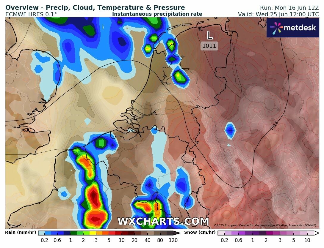 Maar goed, alle opties liggen nog open vanaf maandag, gaande van aangenaam zomerweer (ICON/UKMO/AIFS) tot 3 dagen hitte (GFS/EC). Nog genoeg tijd om er vanaf te snoepen. Bij EC lijkt de hitte wel afgesloten te worden door onweersbuien in de loop van woensdag.