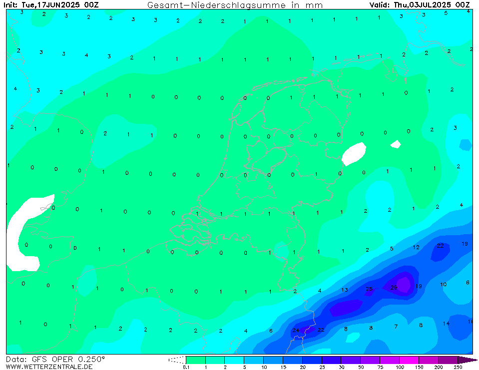 Oper GFS1700 - t/m +384 uur overwegend 0 tot 1 mm neerslag