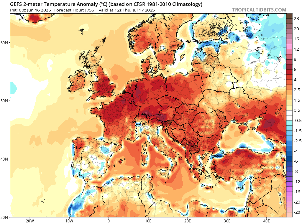 Hier bijvoorbeeld voor 17 juli (12z), met een gemiddelde afwijking van circa 5 graden boven de norm in onze omgeving.