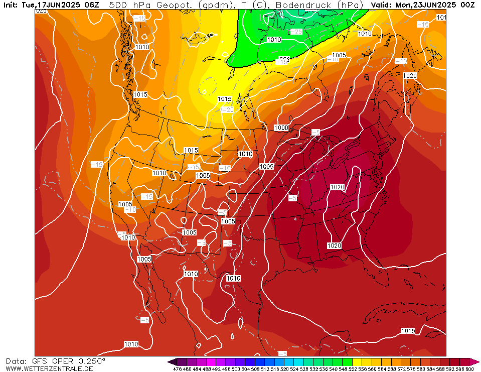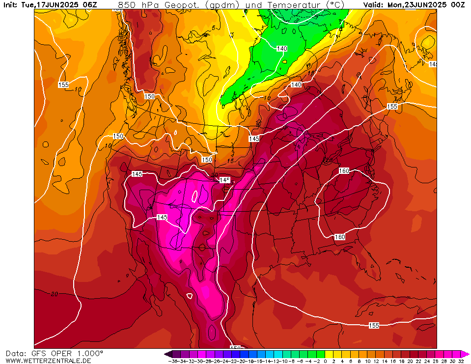 Hitte bastions zie je werkelijk overal zo ook boven de VS. Vooral oostelijke deel buitengewoon warm. Steden als Baltimore rondom en na het weekend richting 40 graden. Gevoelstemperatuur al snel richting 50 met al dat vocht in de lucht daar. Het is niet als in de winter dat de kou meestal uitzakt richting een bepaald continent. Deze hitte bouwt zich tegelijkertijd overal op en slaat hard toe rondom de gematigde breedten.