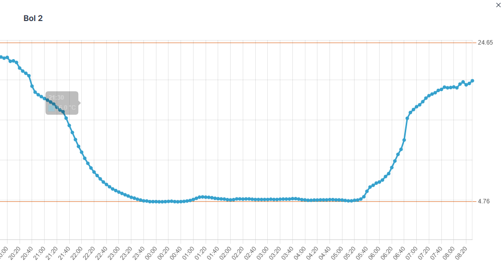 Goed te zien is dat zodra de zon op is, de grondinversie snel doorbroken wordt. Inmiddels is na een Tmin van 4,8 de 20 graden alweer in zicht. Op de site van Reinout van den Born kun je de metingen live volgen.