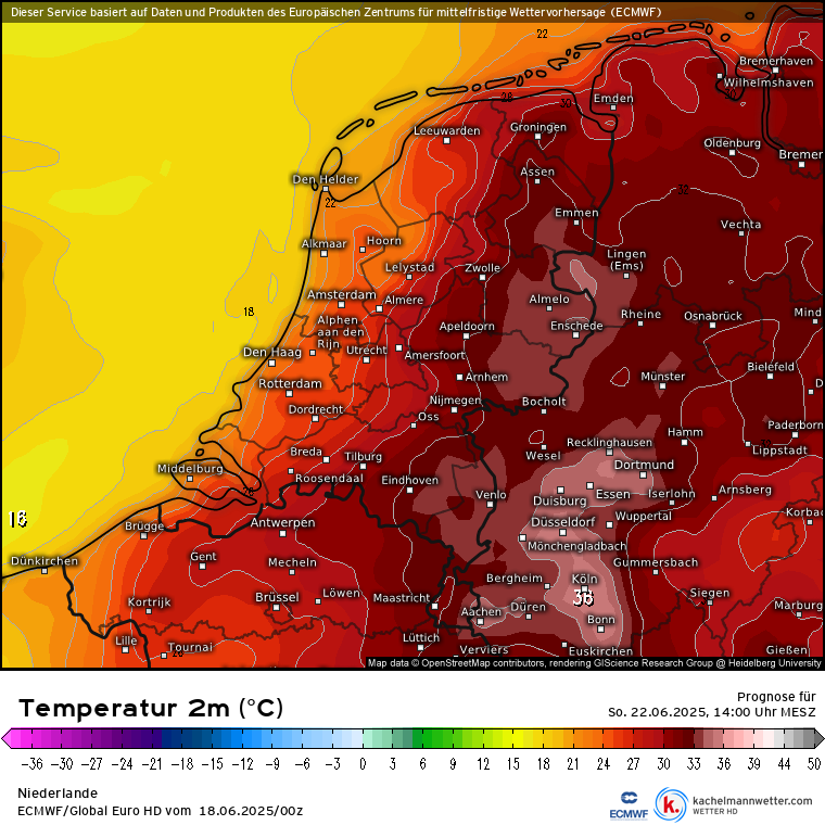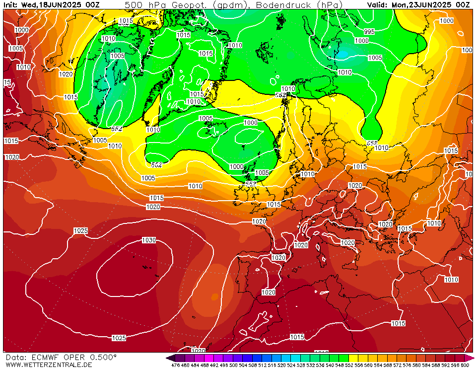 Je ziet iets vergelijkbaars bij UKMO en ICON. We ontsnappen hier aan maxima boven de 35°. Lokaal wel nog in regio ZO mogelijk tijdelijk. Erna blijvend warm tot zomers warm (regio Z/Vlaanderen) maar zonder excessen. Op 26 juni dan weer >25° voordat enkele buien doortrekken. Kortom: blijvend structureel droog.