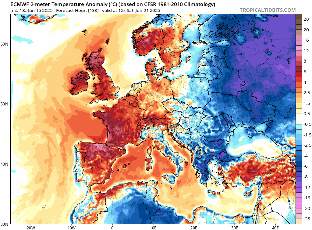 De zaterdag is t.o.v. een paar dagen terug flink opgewarmd (eerst nog amper zomers, inmiddels ruim tropisch), de zondag komt de koelere lucht juist eerder.