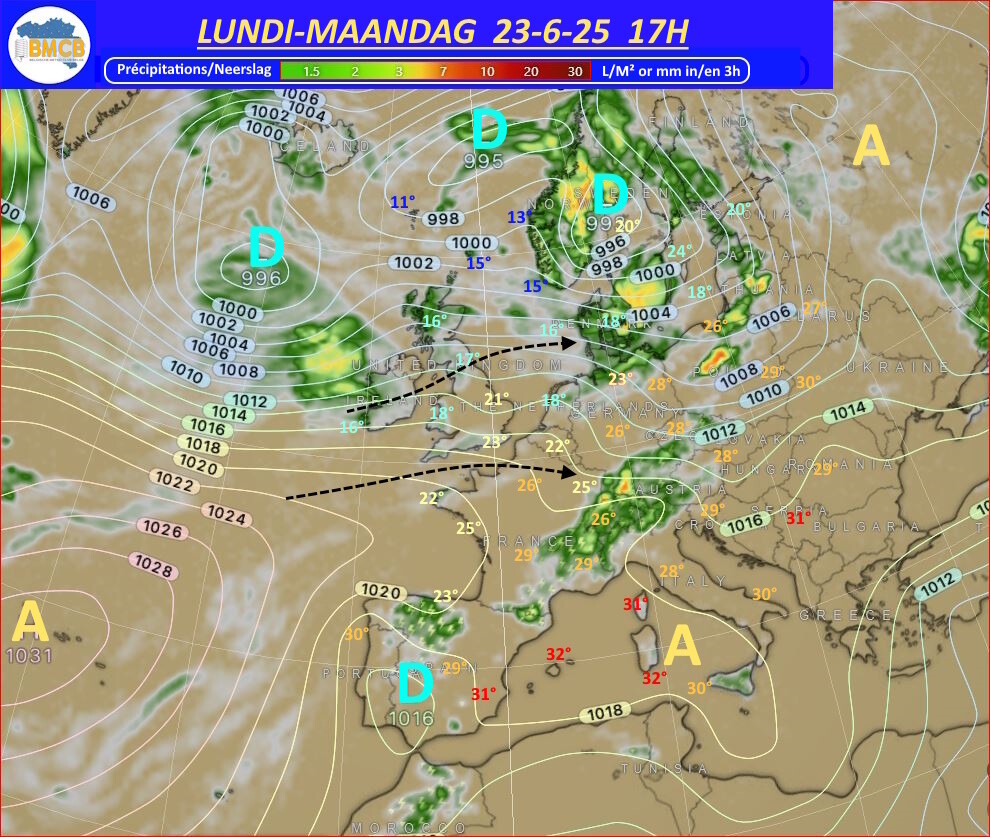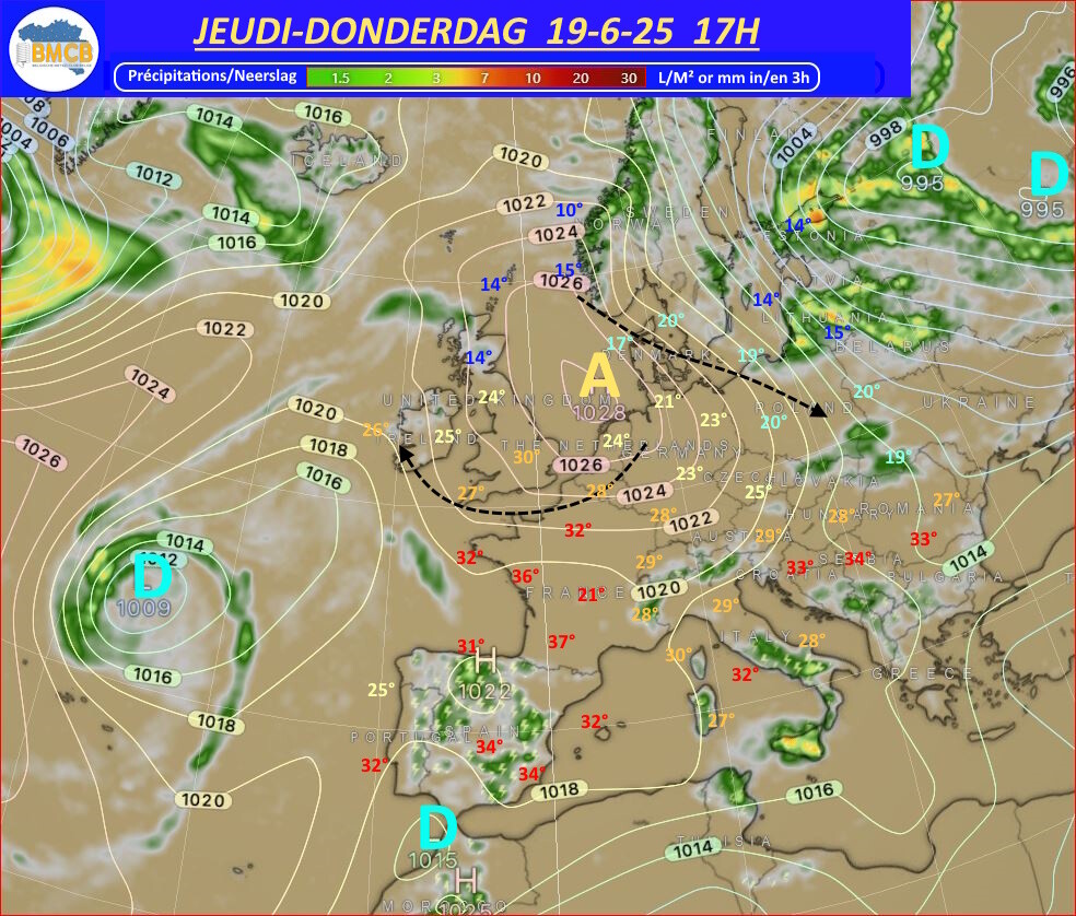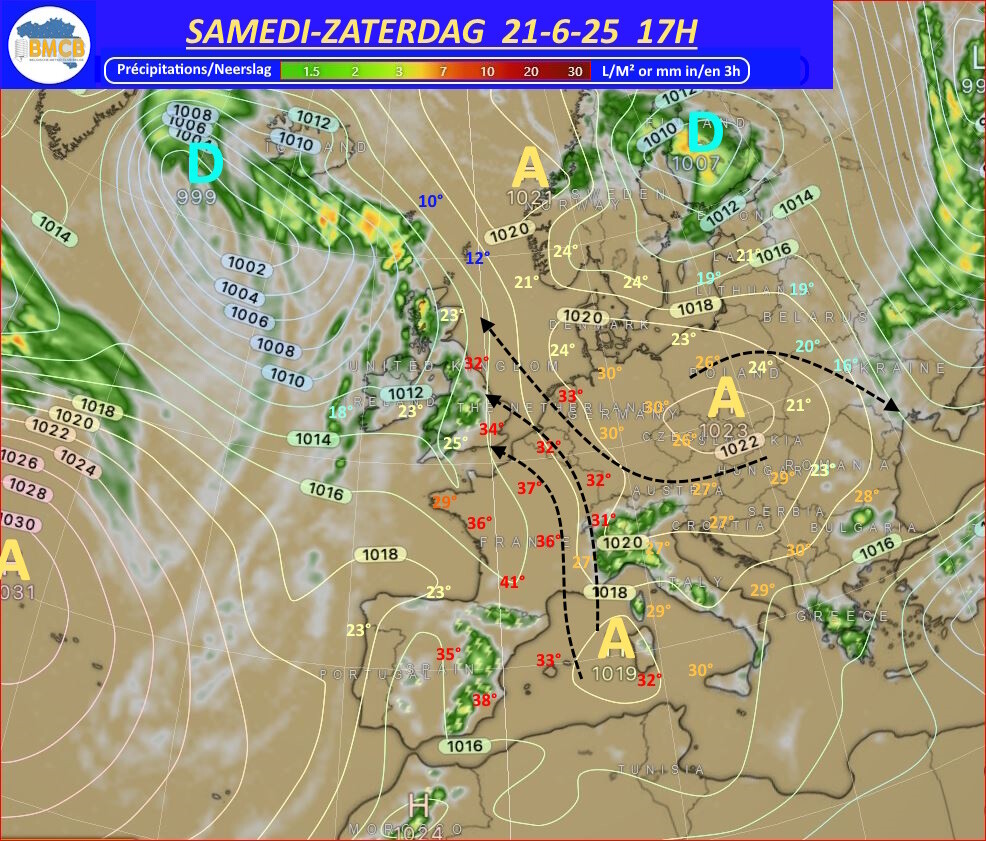 Doordat het hogedrukgebied zich verplaatst naar Centraal-Europa, draait de wind naar het zuidoosten en brengt zeer droge, hete lucht vanuit het Middellandse Zeegebied. Op zaterdag stijgen de temperaturen tot 32 à 35°C in het grootste deel van het land, met iets lagere waarden in de Hoge Ardennen (28 à 32°C). Zondagochtend blijft het wisselend bewolkt met mooie opklaringen, maar in de namiddag kunnen er enkele buien of een lokale onweersbui ontstaan. De wind draait naar het zuiden tot zuidwesten met rukwinden tot 55 km/u.