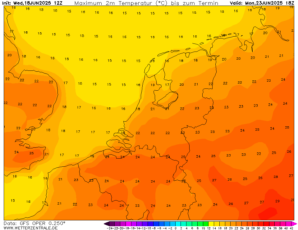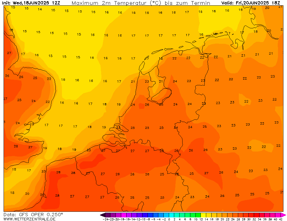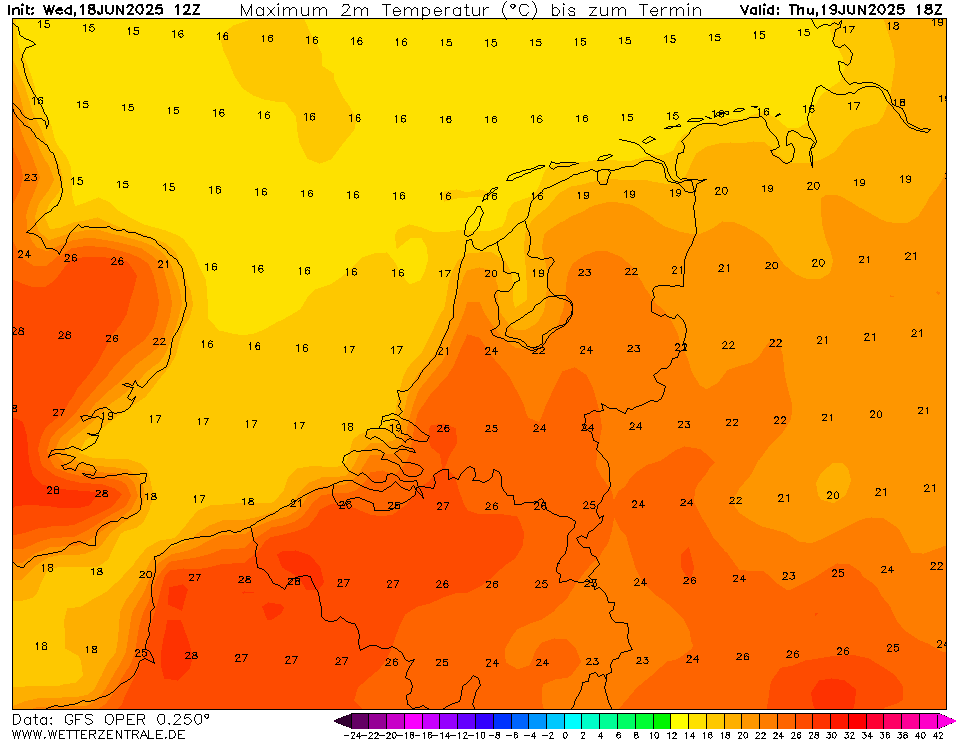 Oper GFS1812 - do (26-6) neerslagzone, plaatselijk minder warm
