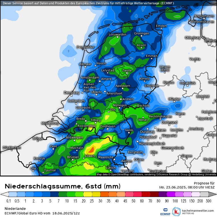De neerslagkaart geeft een 6-uurs som, dus geen totaal van deze hele situatie.