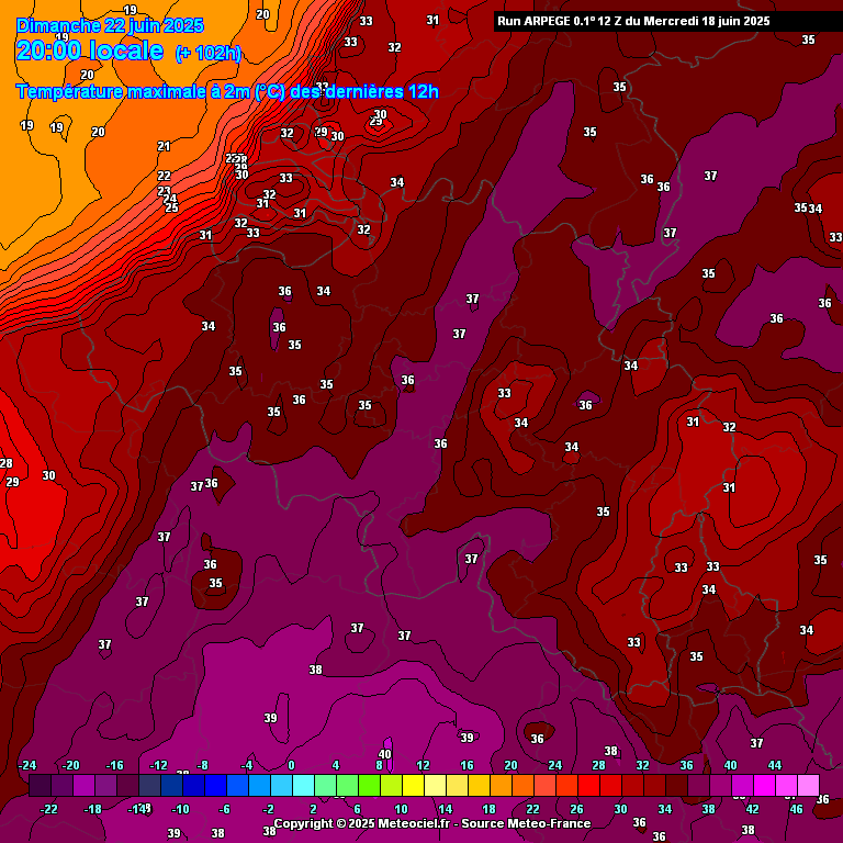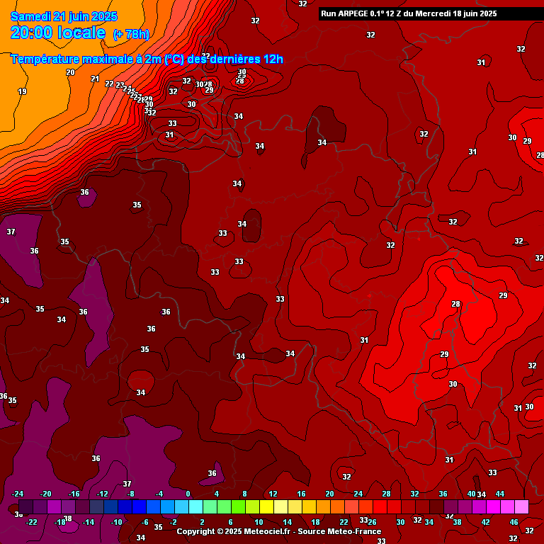 De 00z gaf vanmorgen zoals Icon 33 a 34°C op zaterdag. Maar zo te zien doet Arpege 12z er een schep bovenop een model die het niet zo slecht deed in 2019.