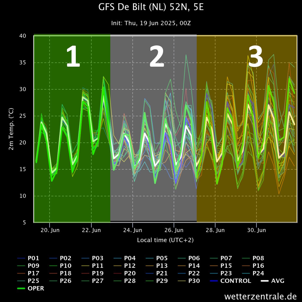 3) Azorenrug staat te popelen. Precieze positie bepaalt het weer. Grote verschillen tussen noord en zuid. België en Zuid-Nederland dichter bij de rug, met voortdurende subsidentie en zon steeds warmer. Noorden koeler. Als hoogterug op gegeven moment weer oostwaarts geduwd zou worden (scenario Oper) volgt hittegolf. Erg onzeker, rug kan ook overlopen worden (zoals in de huidige opstoot komende maandag zal gebeuren). In dat geval blijft het bij korte opstoot met snel overname westenwind.