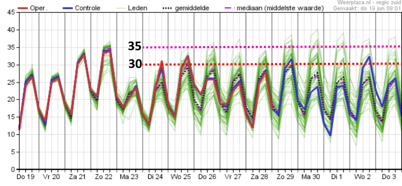De hitte zit dichtbij, een groot deel van het continent vult zich ermee. Na de excessen komend weekend (35 graden mogelijk) zie je ook woensdag alweer potentie tot tropische warmte. En daarna ook een cluster members met dertigers. Met een Azorenrug die een filiaal uitwerpt over het continent is nog niets zeker. Iets noordelijker, weinig stroming, subsidentie en zon en je hebt een hittegolf te pakken. Iets zuidelijker en je zit met gematigder weer met (zuid)westenwinden. Het gemiddelde zegt even niet zoveel, zal er echt van afhangen waar die rug zich positioneert. Het gekozen scenario is bepalend.