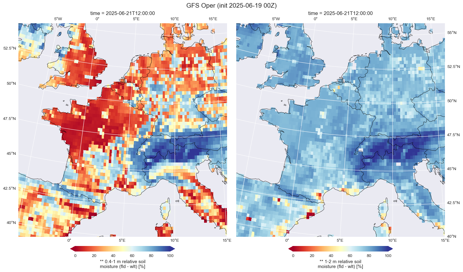 In 2022 & 2023 zag het er vergelijkbaar uit, ook met de droogste regio in NW Frankrijk. En ook weer met de erg natte laag beneden 1 meter, maar in het model kan de vegetatie daar overduidelijk niet bij. Vermoedelijk het gevolg van een landgebruik type als gras/landbouw, en niks anders (geen bomen, struiken etc). Het gebrek aan een ecosysteem met een distributie in eigenschappen maakt dat GFS vrij binair reageert en heel plots omklapt. In een week of drie/vier van potentiële verdamping naar vrijwel geen. Ik had eerlijk gezegd wel verwacht dat dit inmiddels aangepast zou zijn, enkel al Noah LSM updaten naar Noah-MP LSM zou waarschijnlijk al wat betere mogelijkheden geven voor wat betreft dit soort parameterisatie.